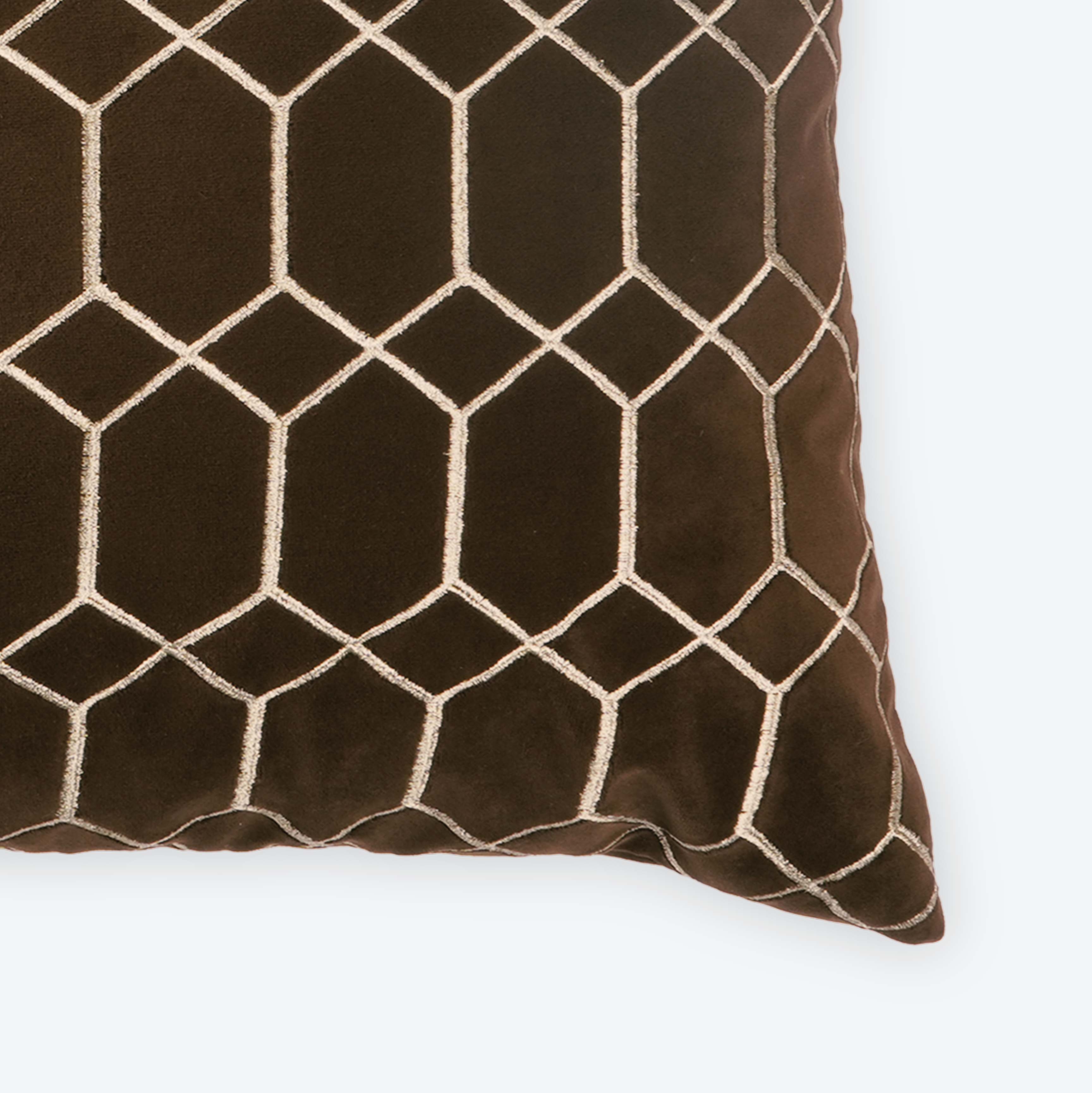 Crafted in plush velvet with a geometric Art Deco-inspired embroidery, the Brown Gatsby Cushion Cover brings timeless sophistication to your living space. The honeycomb pattern in soft metallic thread adds subtle sheen, while the deep brown tone anchors your décor with warmth and polish. Perfect for formal seating or adding structure to neutral settings.