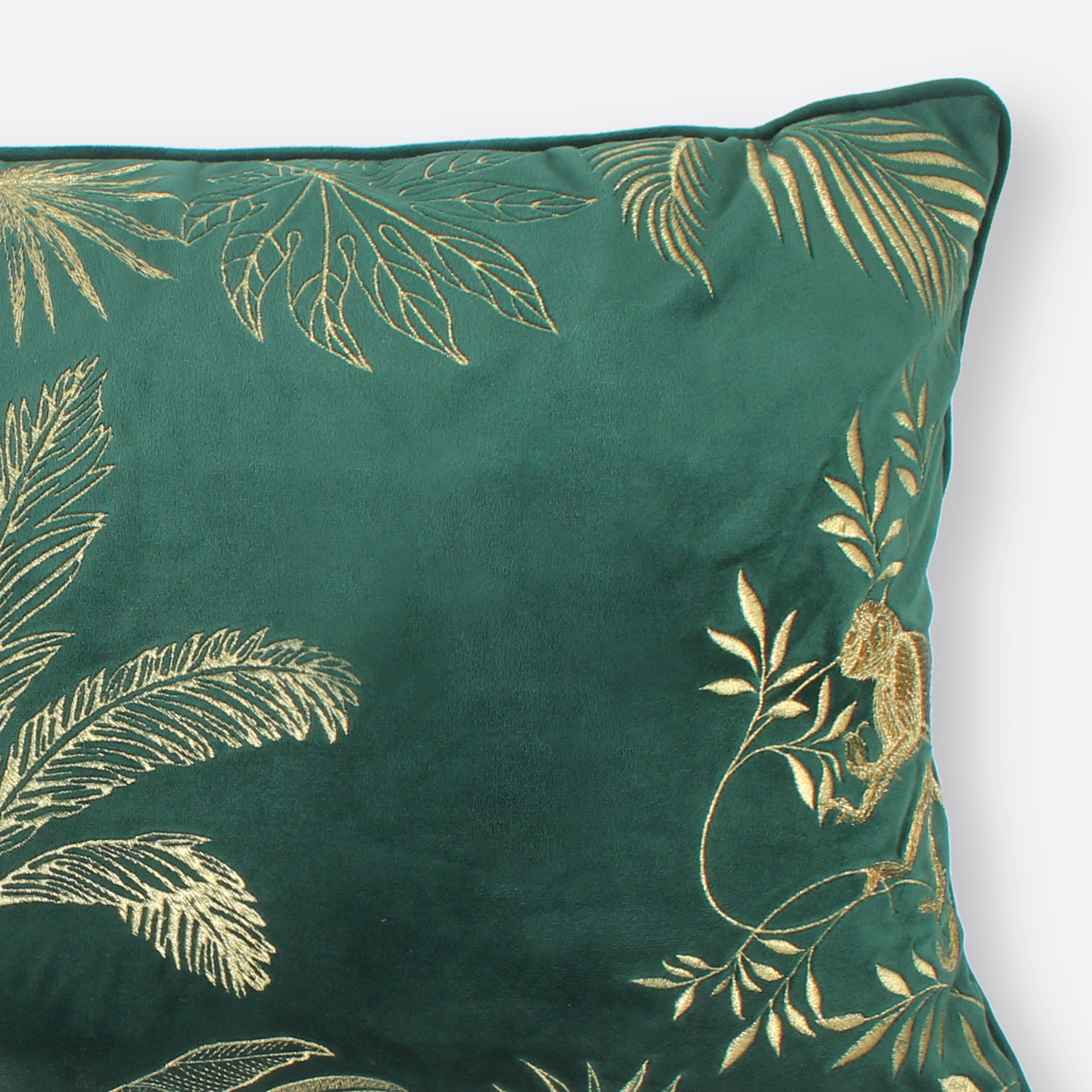 Exotic yet understated, this embroidered velvet cushion features gilded palms and playful monkeys for a hint of adventure. Its elongated form makes it ideal for layering with square cushions — evoking the relaxed refinement of a heritage home.