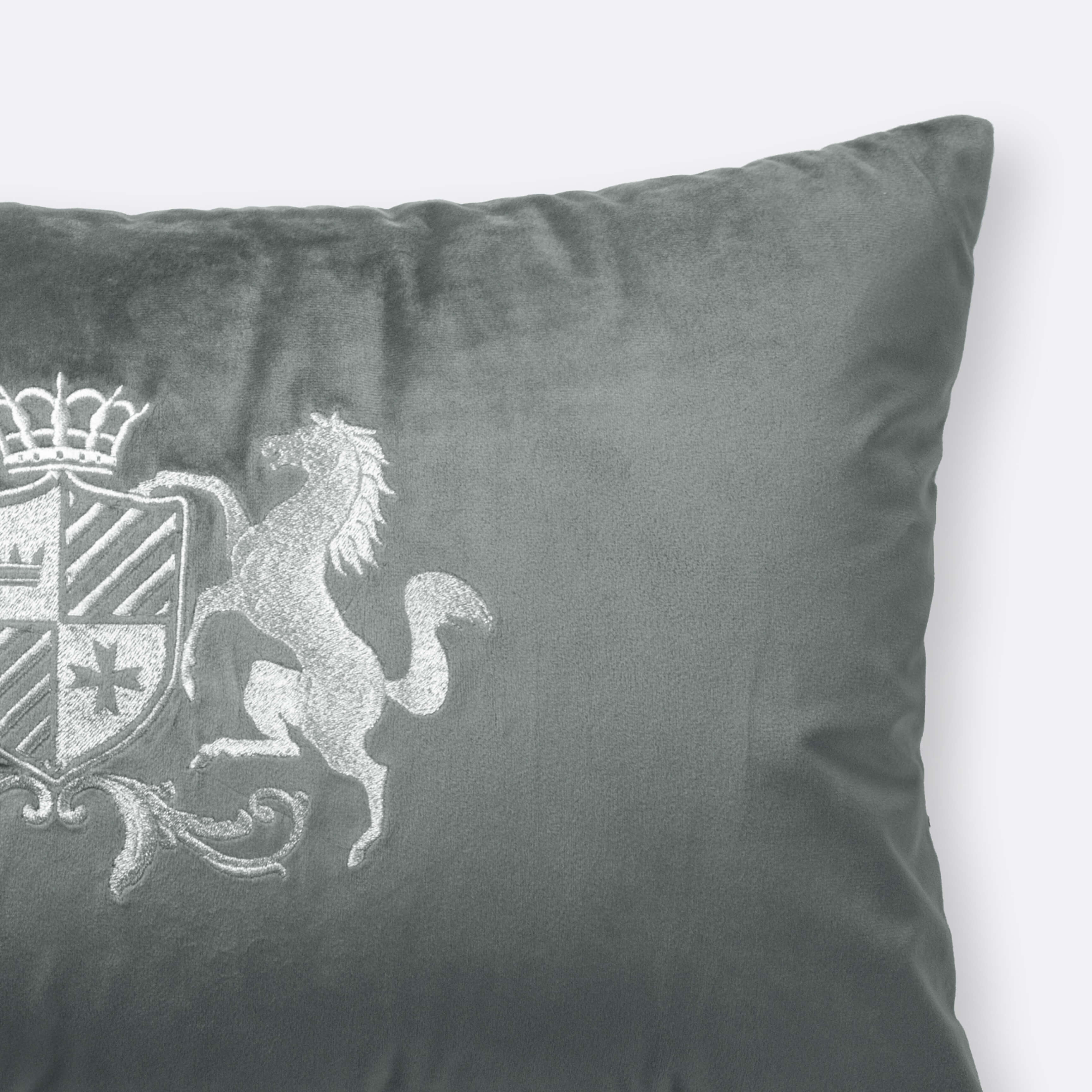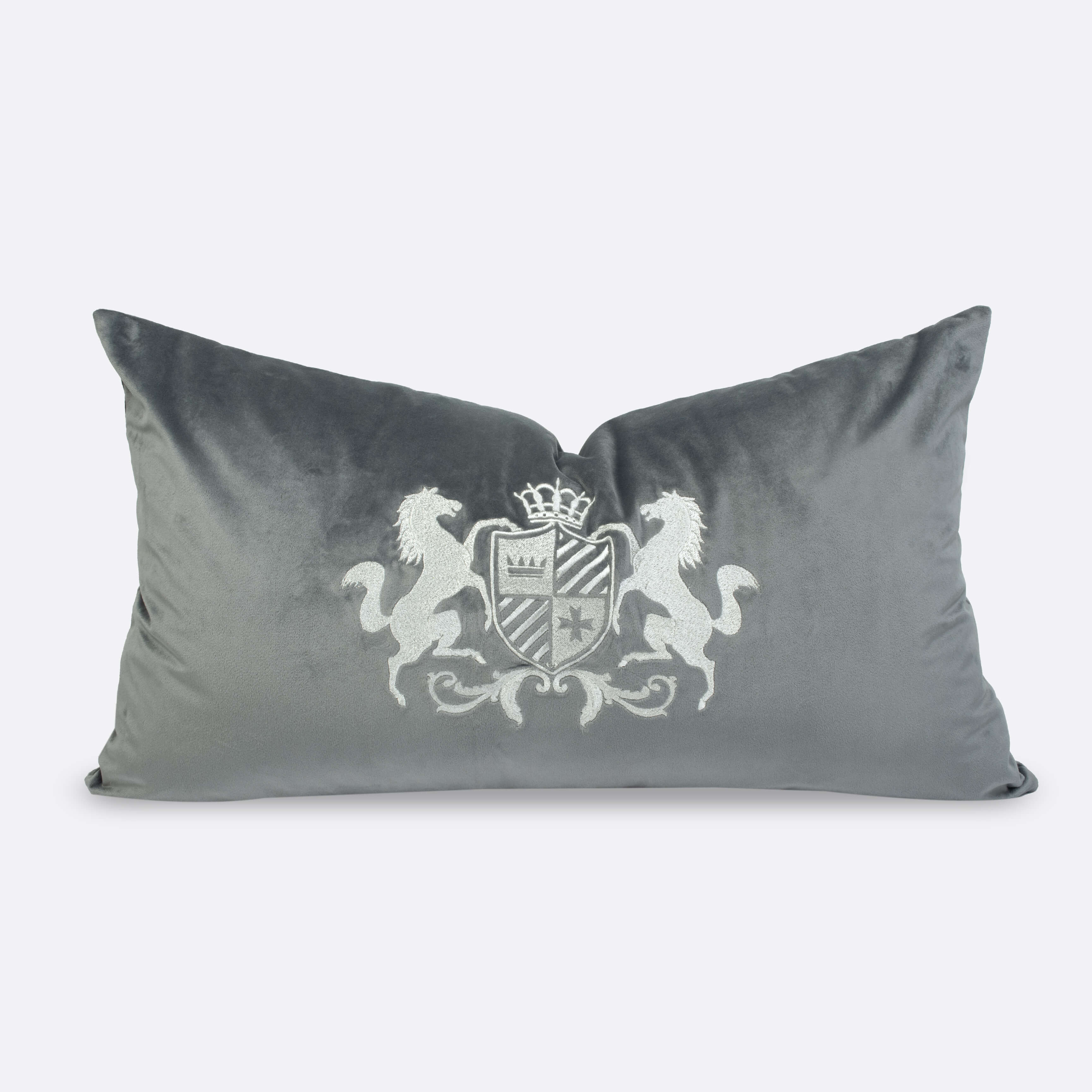 Regal yet restrained, this velvet lumbar carries a noble crest in tonal embroidery — a subtle statement for sophisticated rooms.