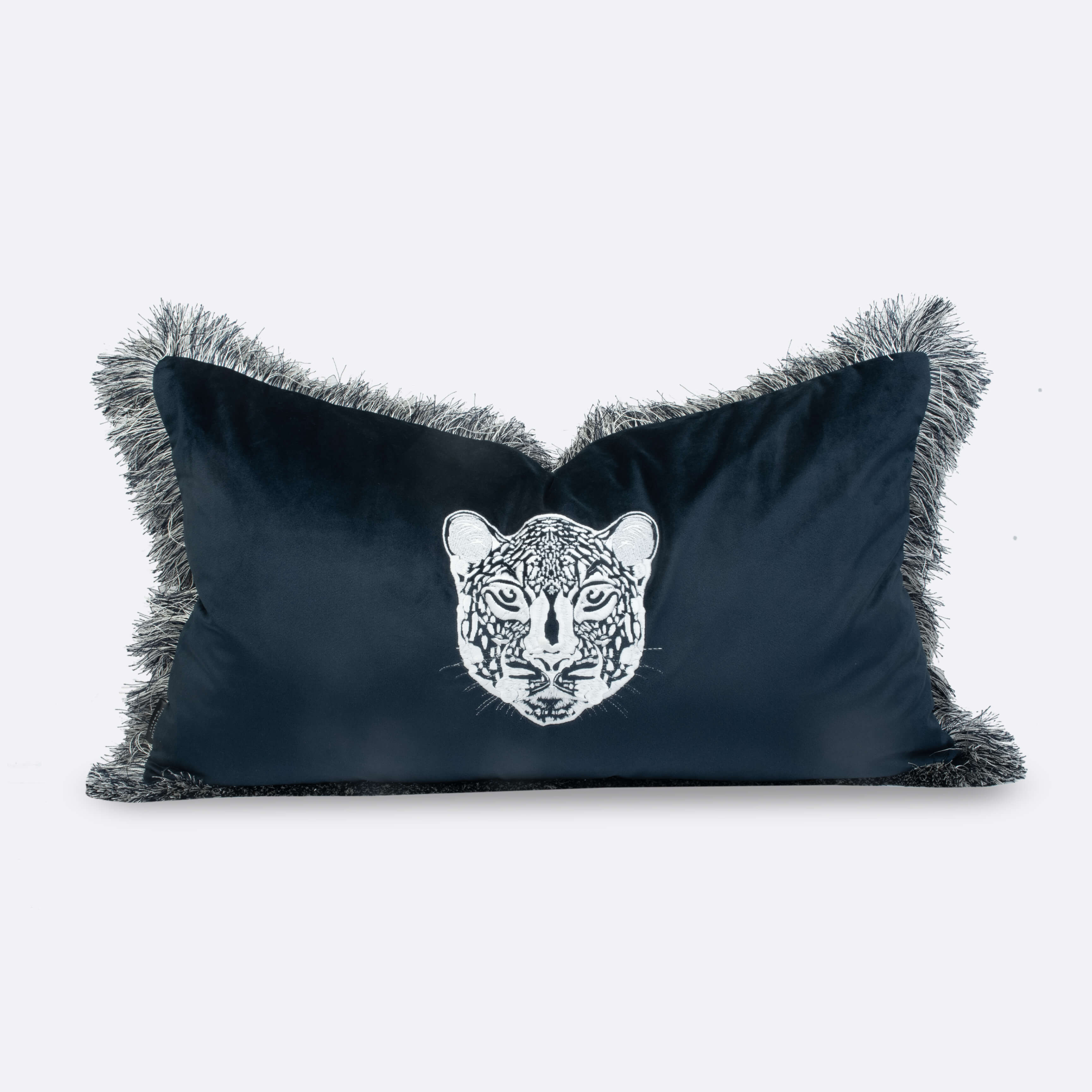 Sleek and sophisticated, the Blue Safari Lumbar Cushion Cover features a central leopard head embroidered in white thread and framed with soft metallic fringe. The effect is both wild and refined — perfect for modern luxury spaces.