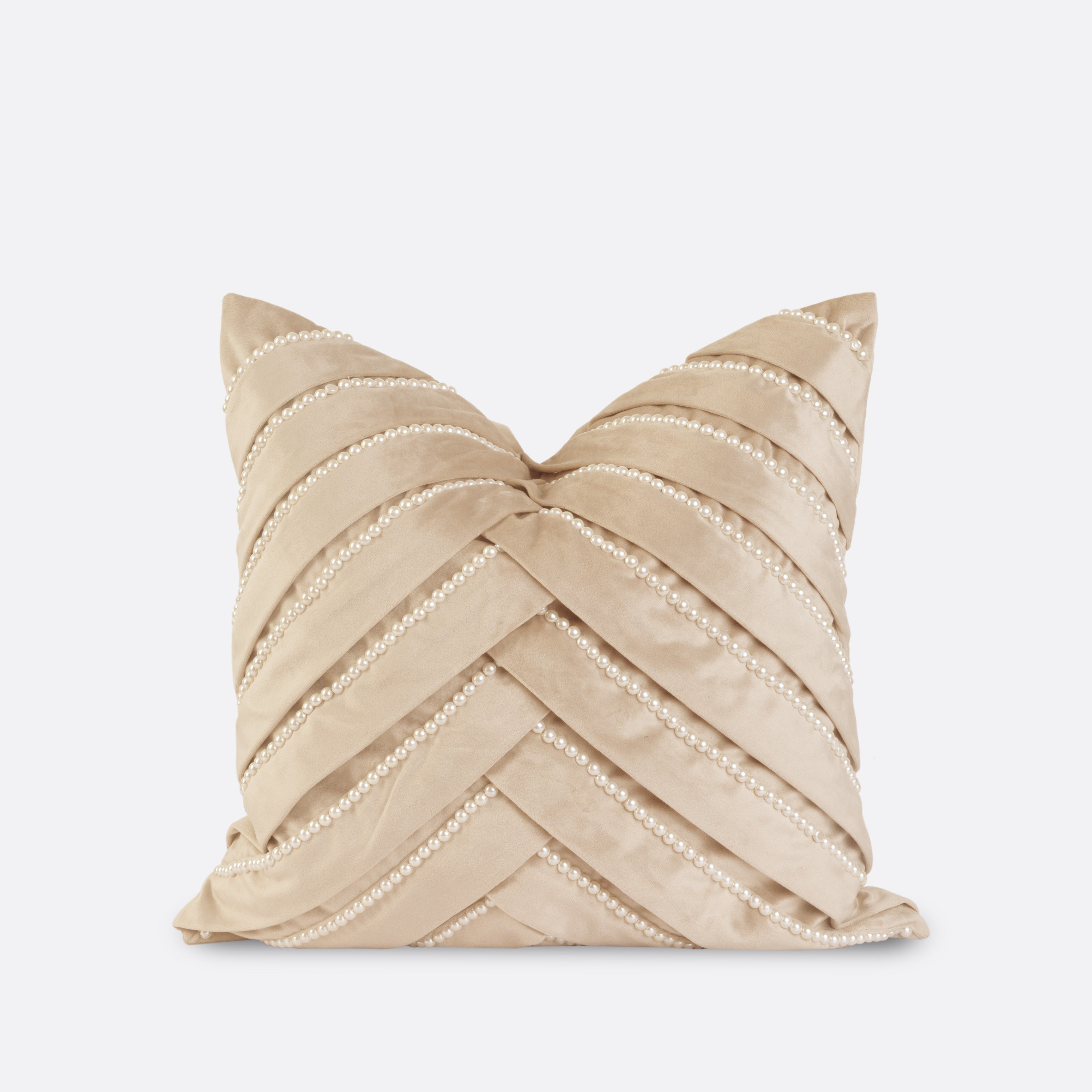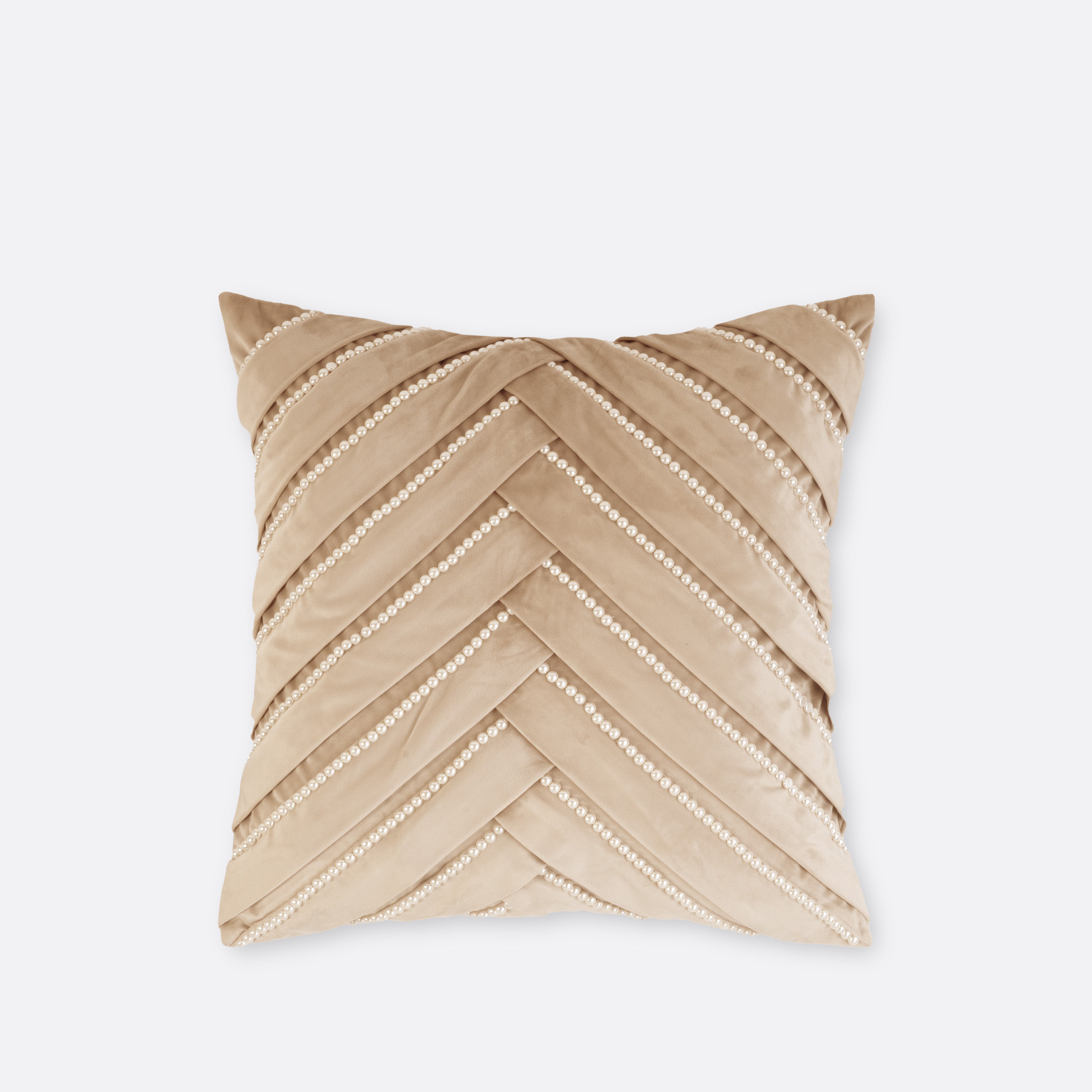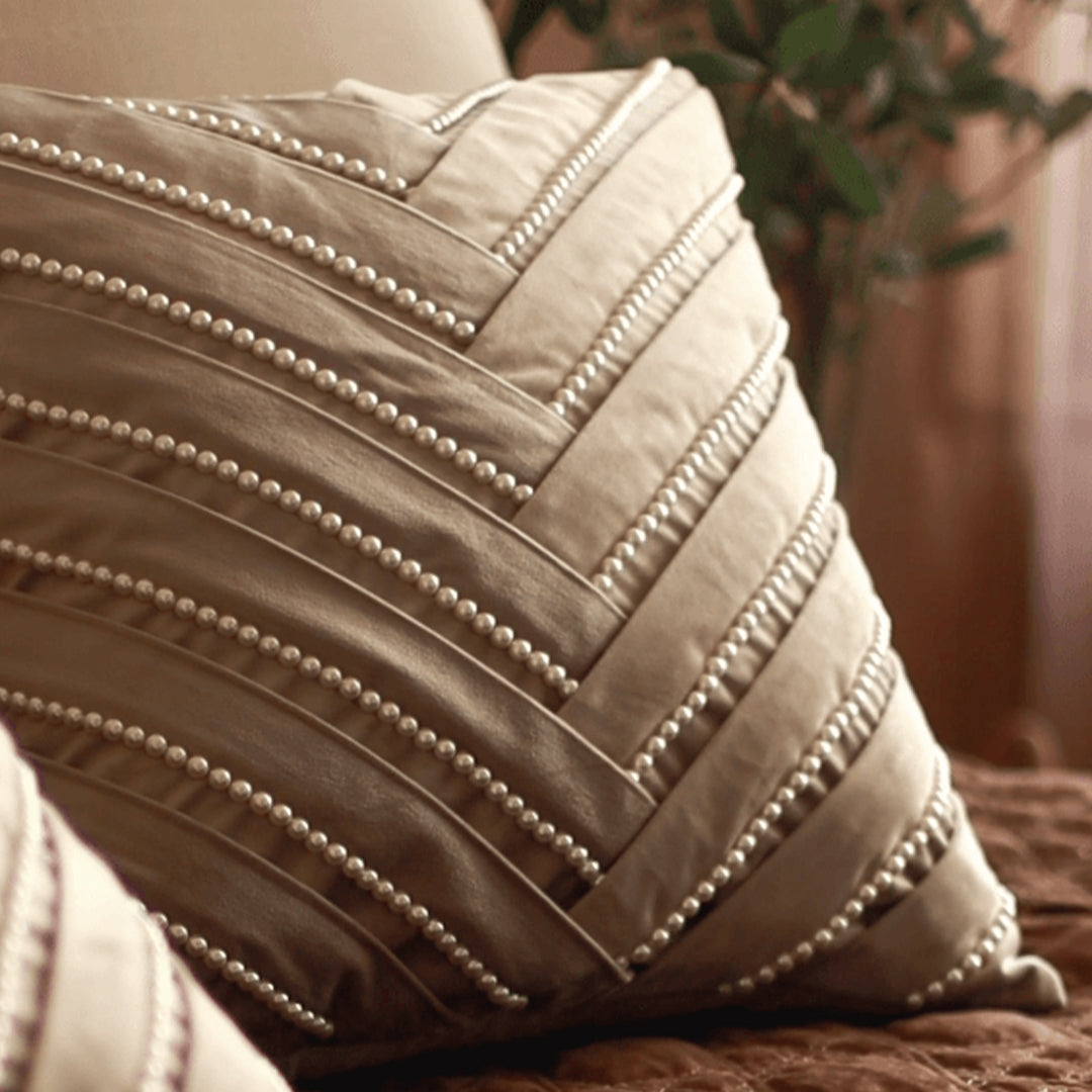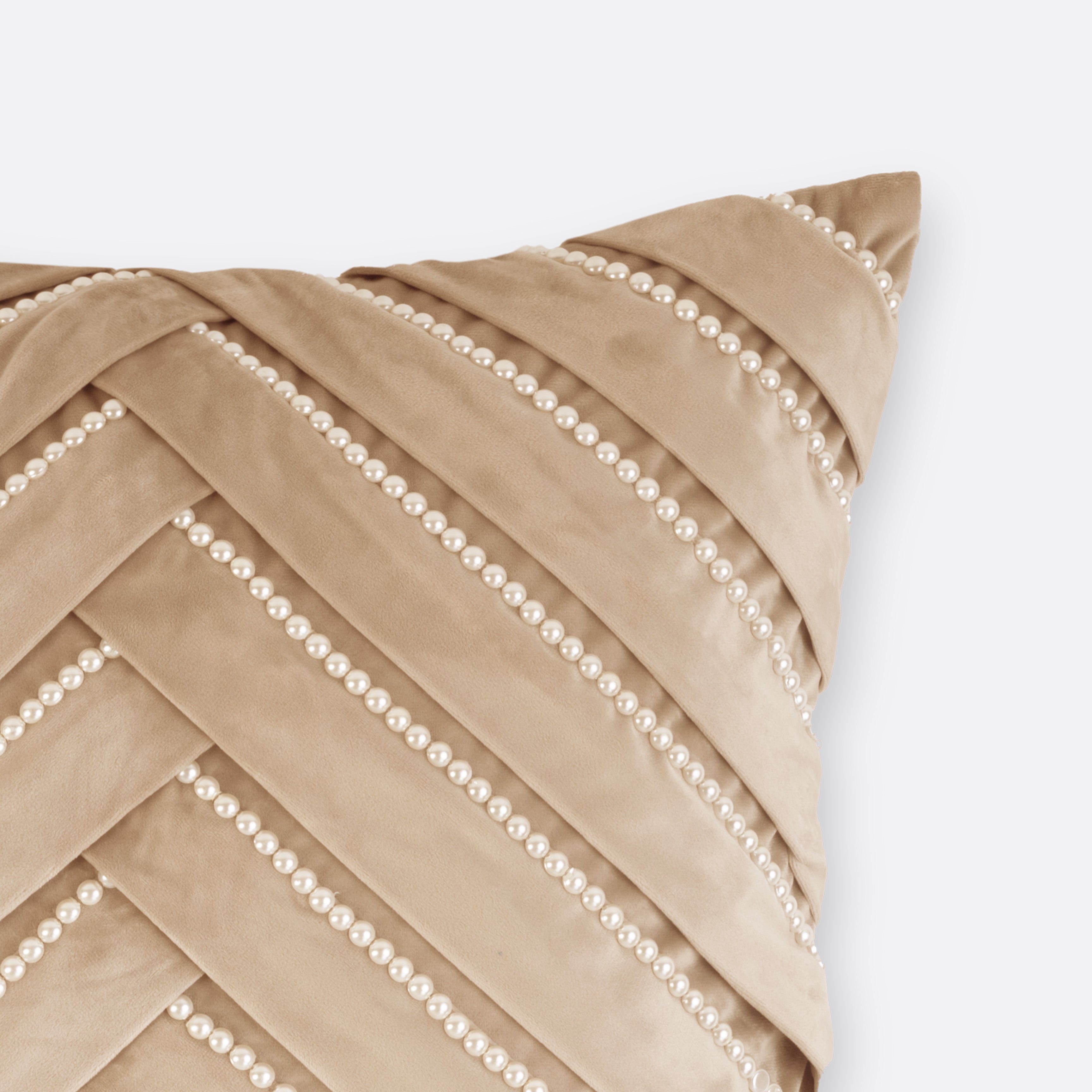The Beige Sophia Pearl Cushion Cover blends tactile luxury with tonal simplicity. Plush velvet is detailed with pleated diagonal panels and fine beaded lines that shimmer softly under light.