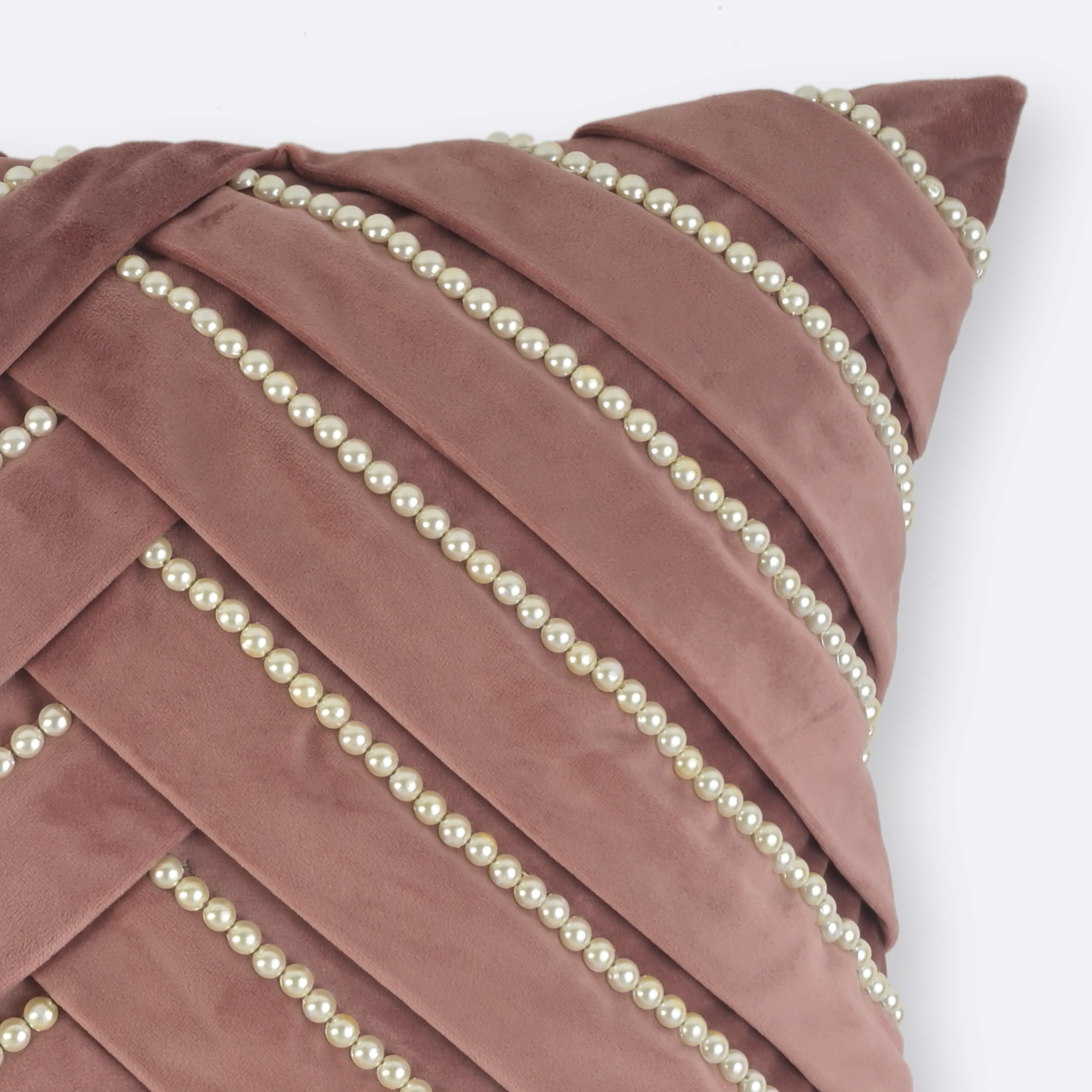 A modern feminine statement, the Pink Sophia Pearl Cushion Cover features velvet panels intricately overlaid with pearl detailing, arranged in a chevron pattern that radiates quiet glamour.