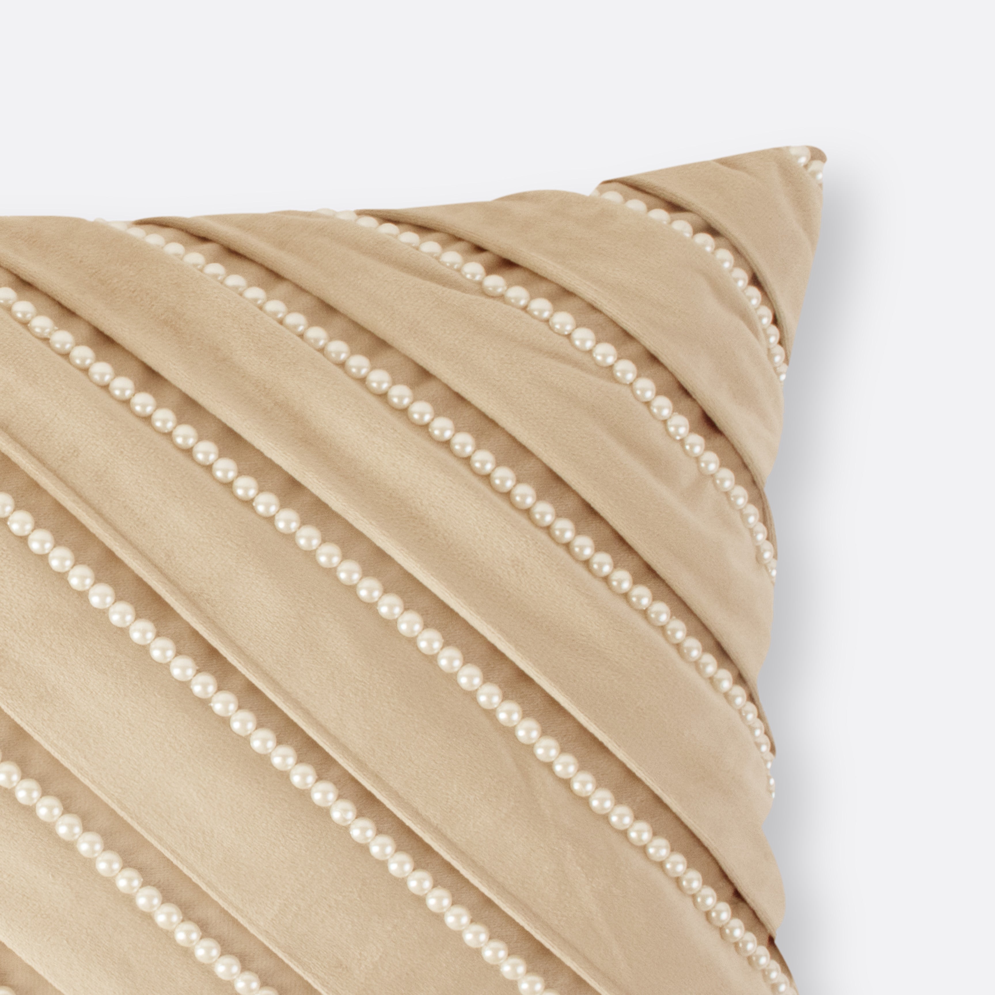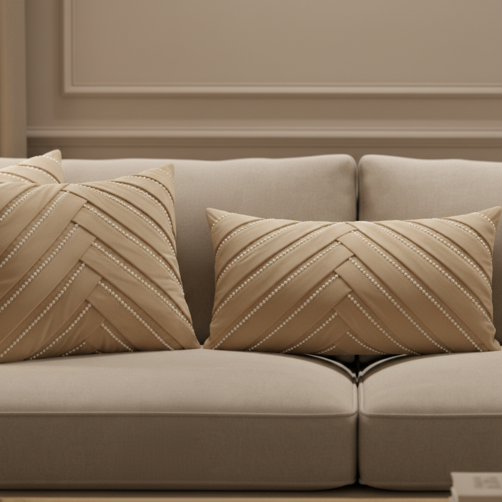 Sculpted and sophisticated, the Beige Sophia Pearl Lumbar Cushion Cover carries a herringbone-style pleated texture finished with subtle beading. Understated yet radiant, it brings polish to beds or lounge corners.