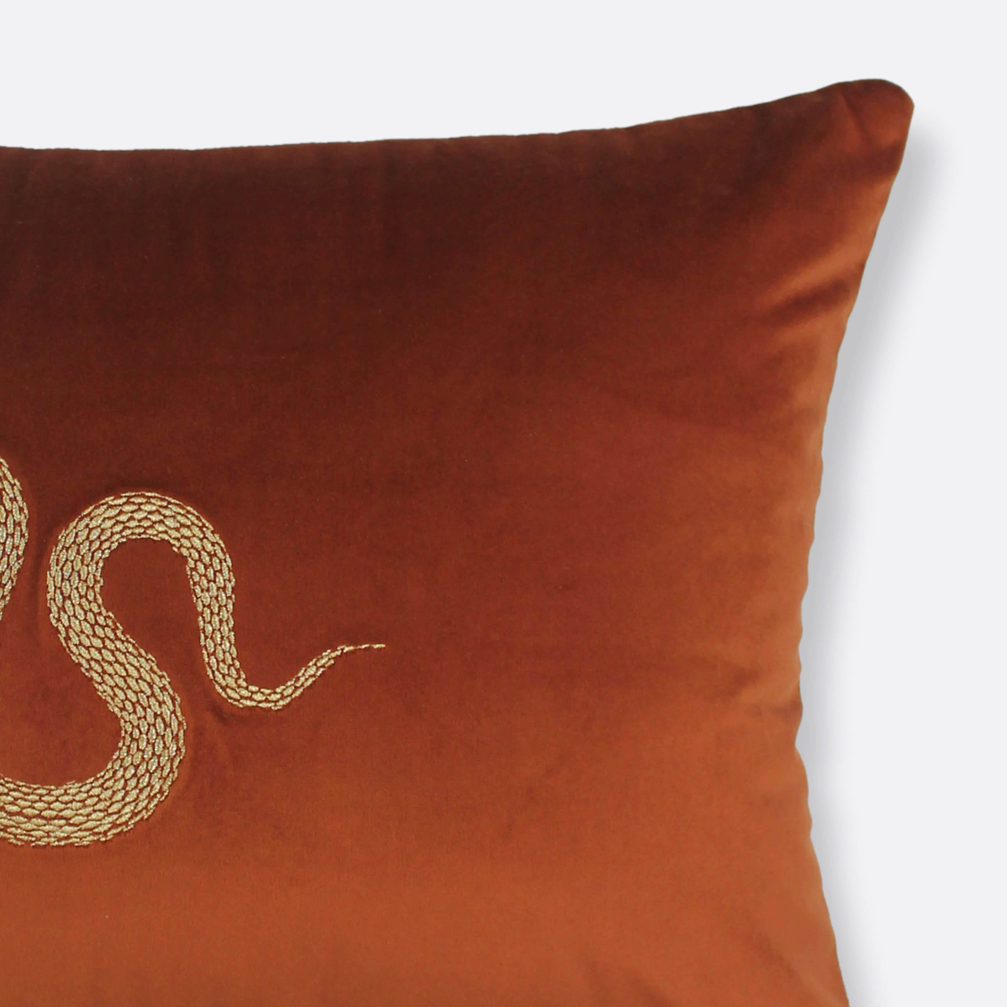 The Amber Snake Lumbar Cushion Cover reimagines the mystique of the serpent in a refined, modern form. Embroidered in gold thread on deep amber velvet, it makes a striking accent for sofas, reading chairs, or layered bedding. Its elongated shape adds dimension while the texture invites touch.