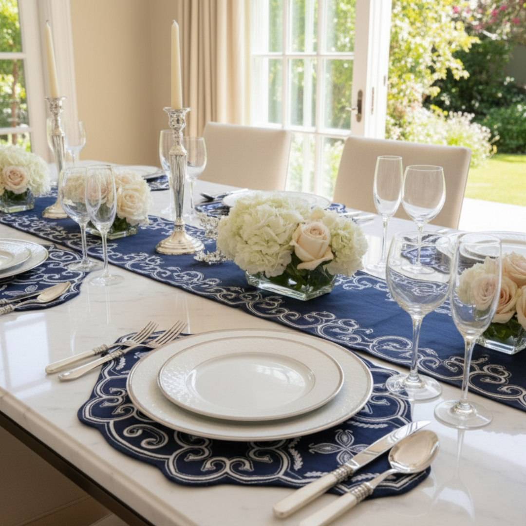Elevate your dining experience with our stylish MEDALLION EMBROIDEMerlot PLACEMAT in a gorgeous shade of blue. Crafted from high-quality materials, these placemats offer both comfort and luxurious elegance to your table setting. Sold in a set of 4, they are perfect for entertaining or adding a touch of sophistication to your everyday meals. Fabric - Cotton Dry Clean Only Exclusive to The Pillow Company Please note that colours on the actual product may vary slightly.