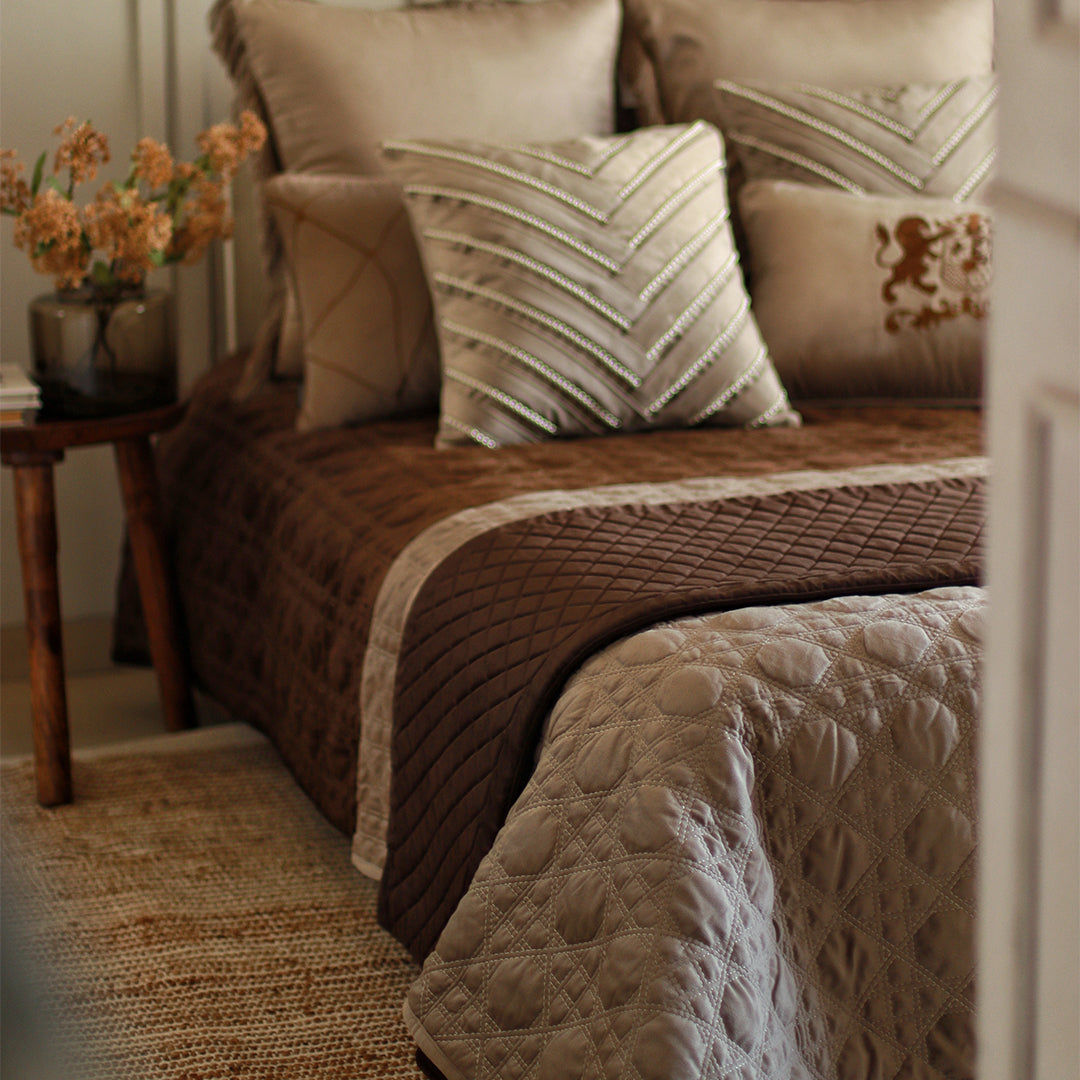 Discover the unique fusion of elegance and comfort with our Brown Velvet Lurex Caneweave Bedspread. This sleek and stylish accessory is crafted with luxuriously soft velvet, providing the ultimate indulgence for your bedding collection. The exquisite caneweave design pairs beautifully with the brown tone, offering a subtle shimmer of Lurex for a universally appealing aesthetic. An ideal choice for those who aspire to create an ambrosial atmosphere in their homes while maintaining a sophisticated presence. Instantly elevate your interiors with this chic centerpiece, which is as comfortable as it is aesthetically remarkable. Fabric - Velvet Dry Clean Only Exclusive to The Pillow Company Please note that colours on the actual product may vary slightly.