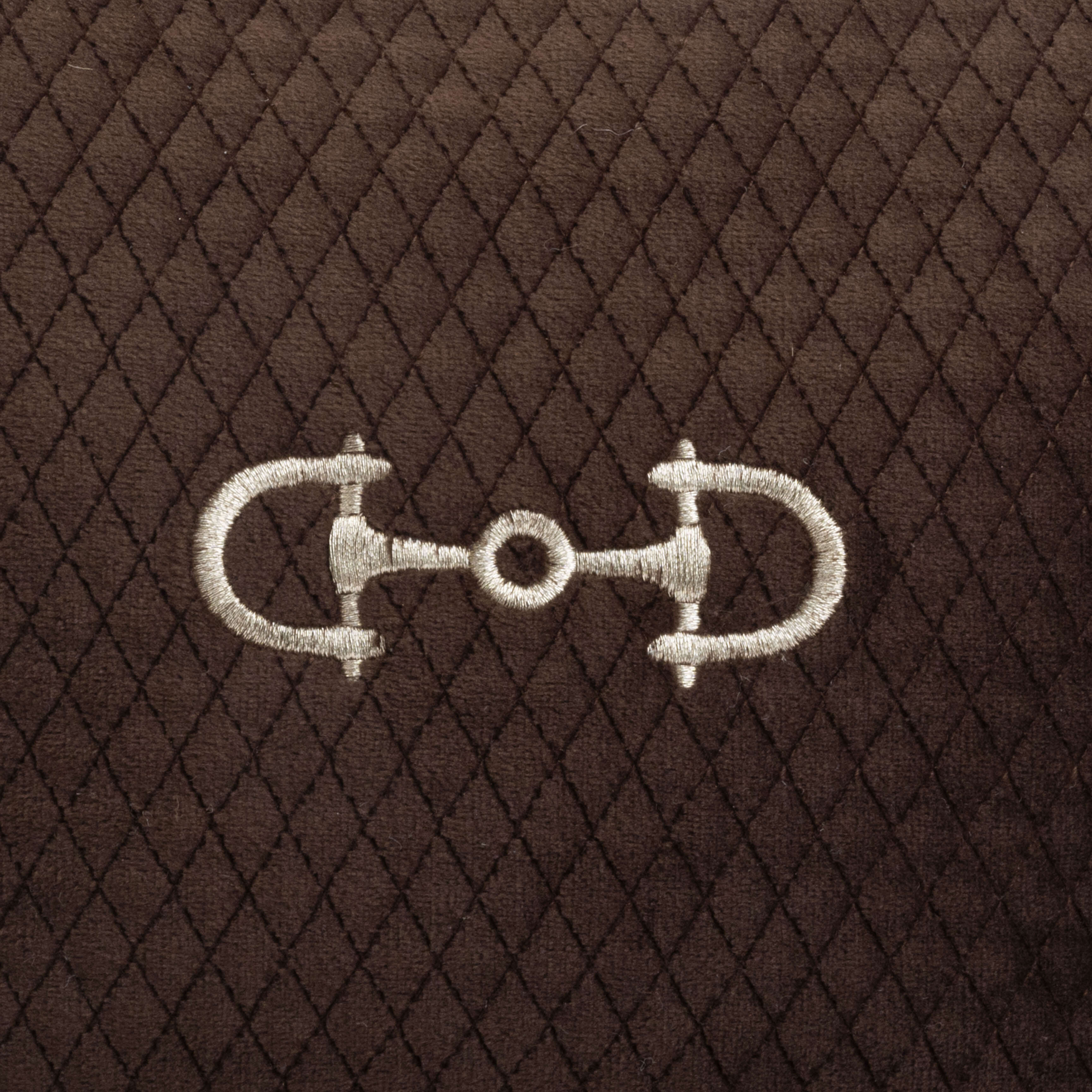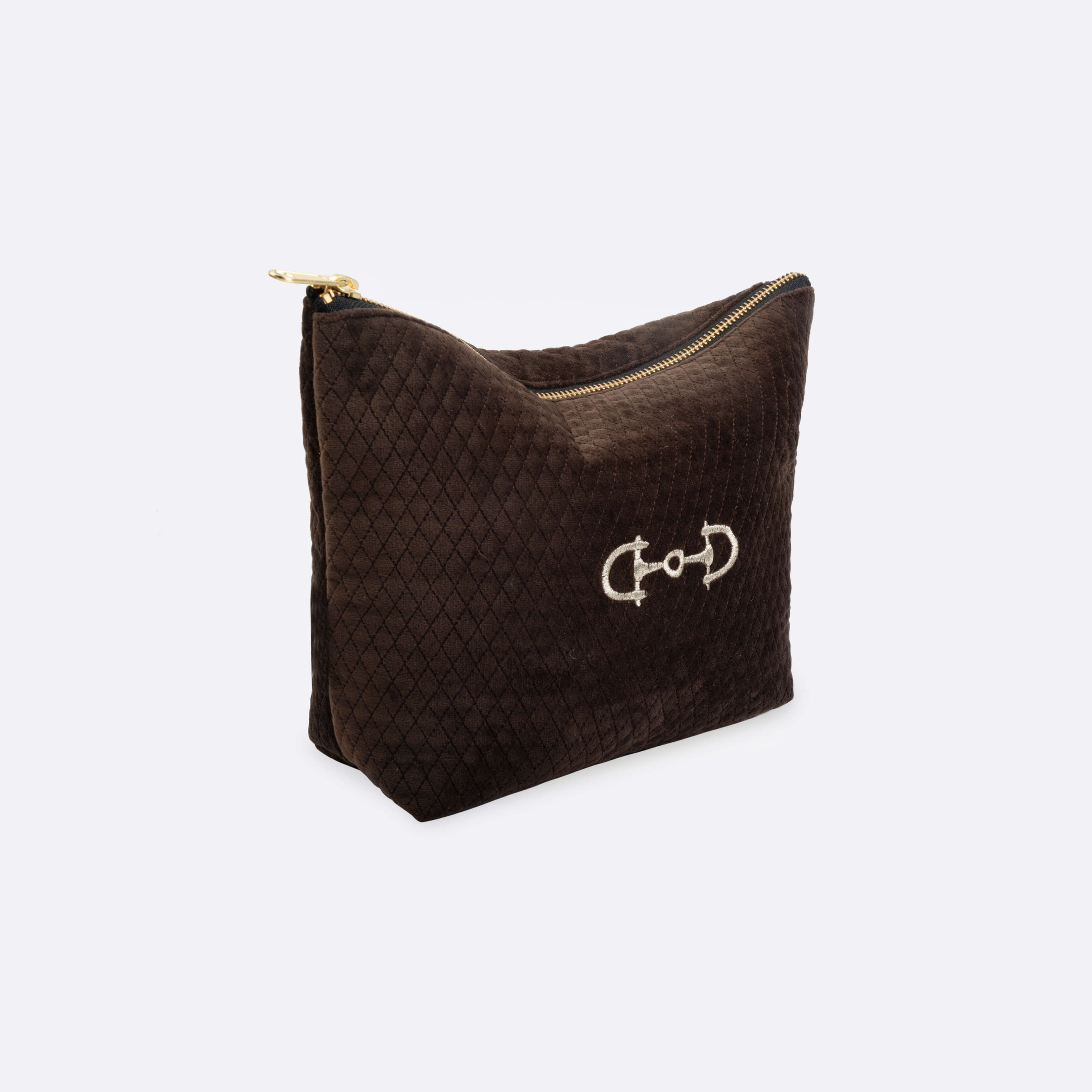 The Brown Snaffle Luxe Pouch brings together equestrian-inspired elegance and modern-day functionality. Crafted in rich quilted velvet with a soft sheen, it features the signature snaffle motif embroidered in champagne thread — a symbol of refined strength and quiet luxury. Perfectly sized to slip into your handbag or carry on its own, this pouch is designed for seamless transitions from desk to dinner, travel to downtime.
