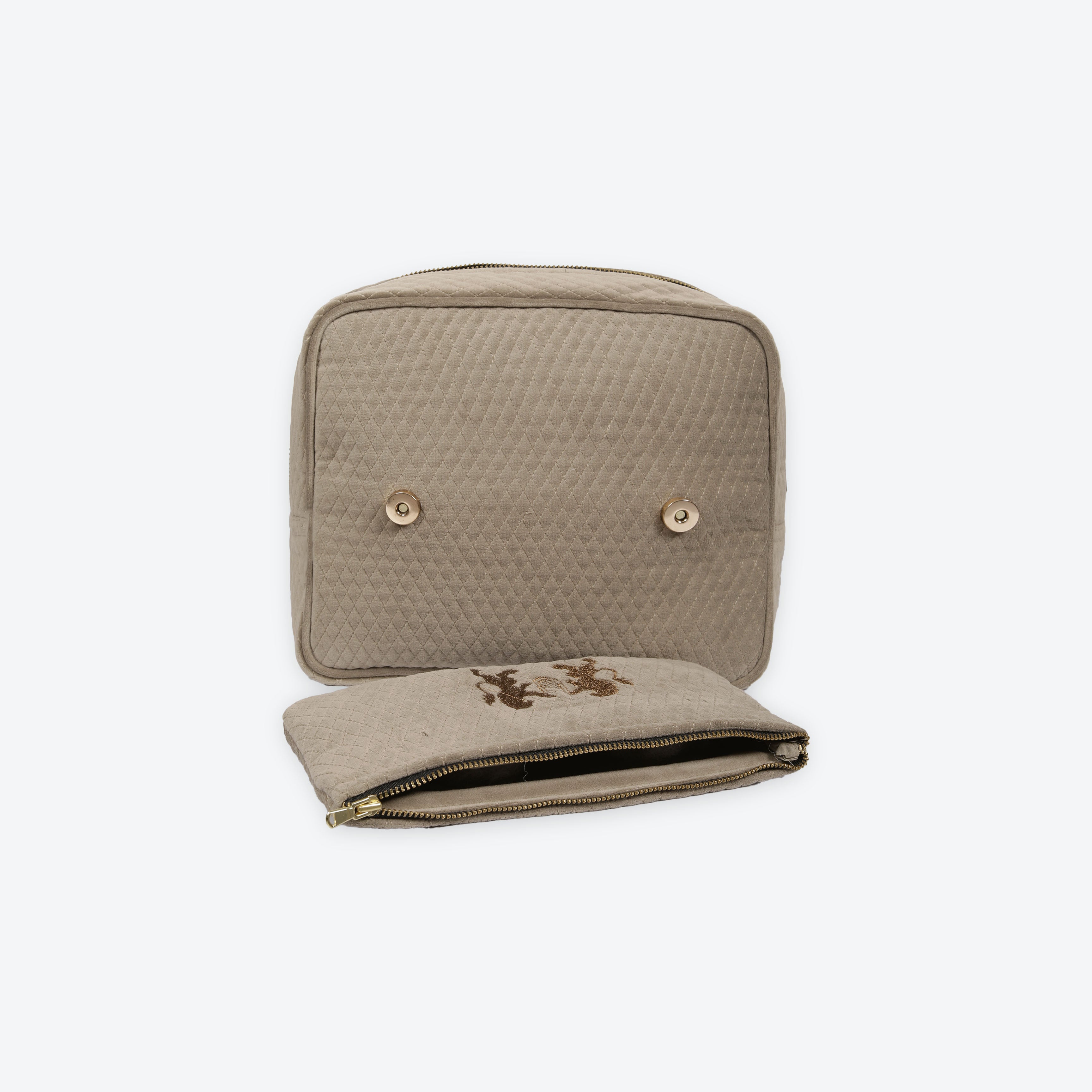 Designed as your personal wellness companion, the Spa To Go Pouch brings intention to every moment of self-care. Crafted in plush quilted velvet with a detachable embroidered mini pouch, it carries everything you need for relaxation — from skincare and serums to travel-sized oils and bath rituals.