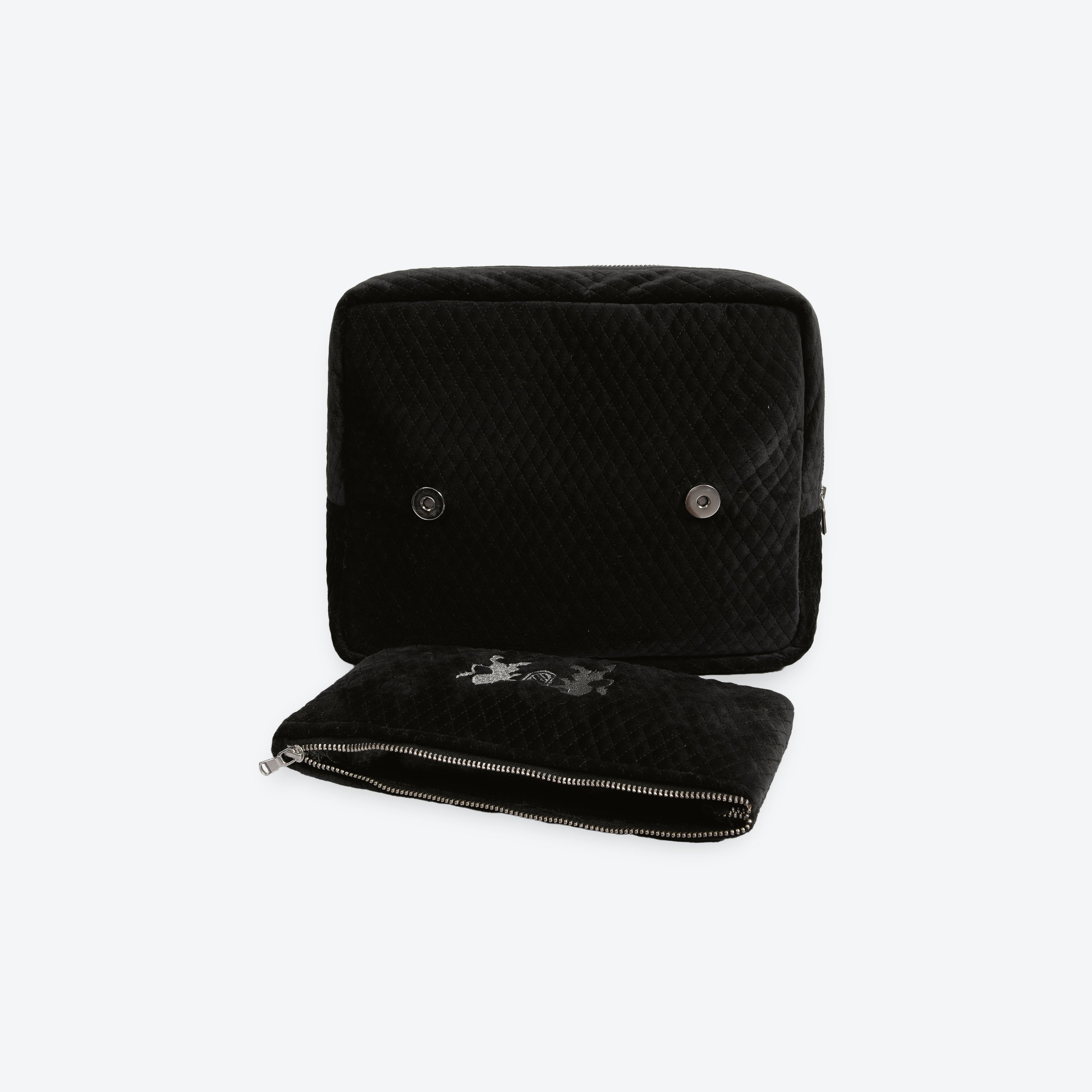Designed as your personal wellness companion, the Spa To Go Pouch brings intention to every moment of self-care. Crafted in plush quilted velvet with a detachable embroidered mini pouch, it carries everything you need for relaxation — from skincare and serums to travel-sized oils and bath rituals.