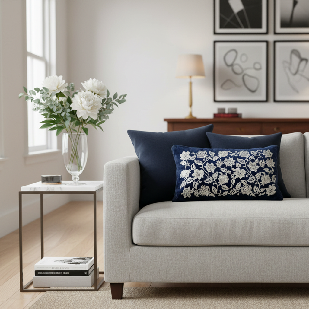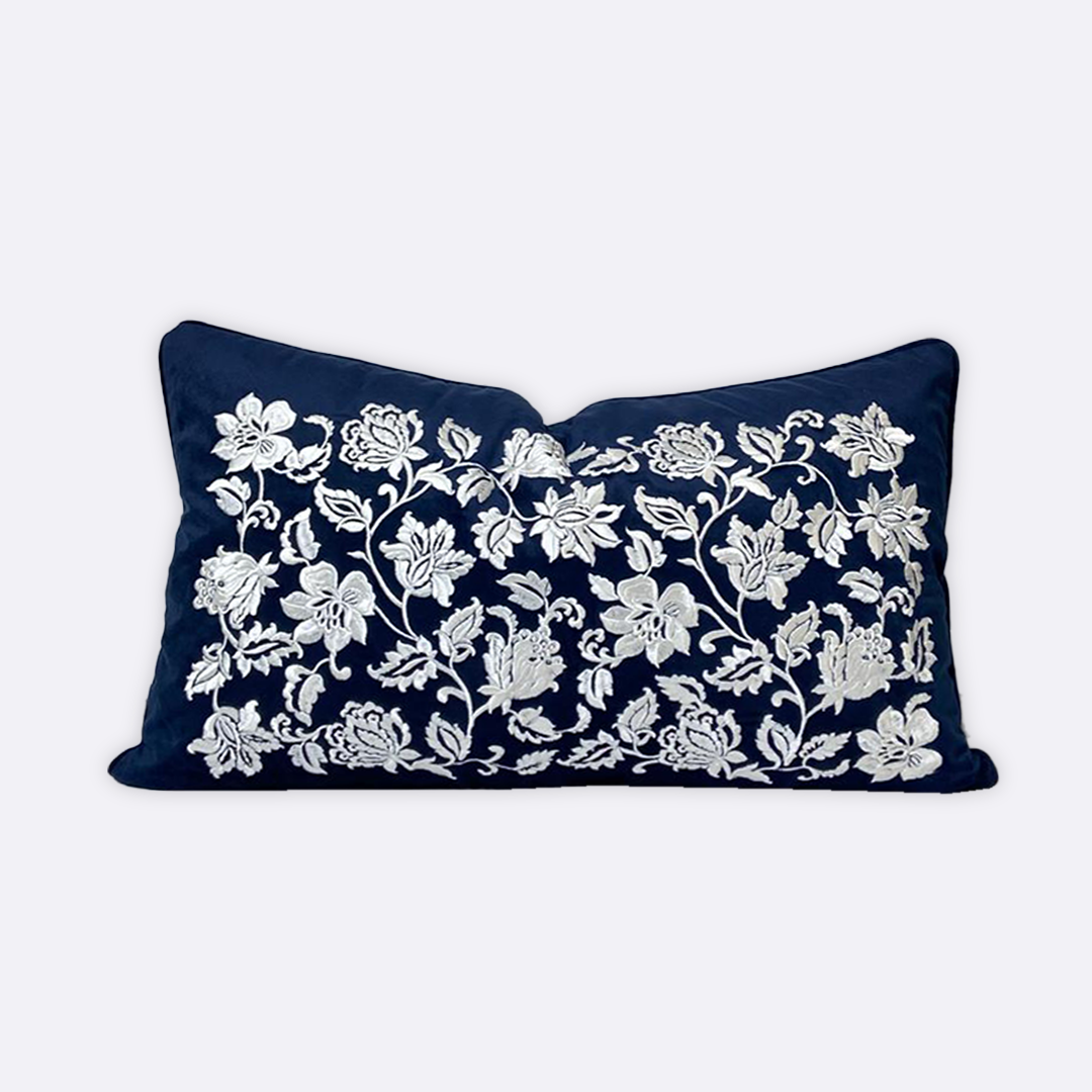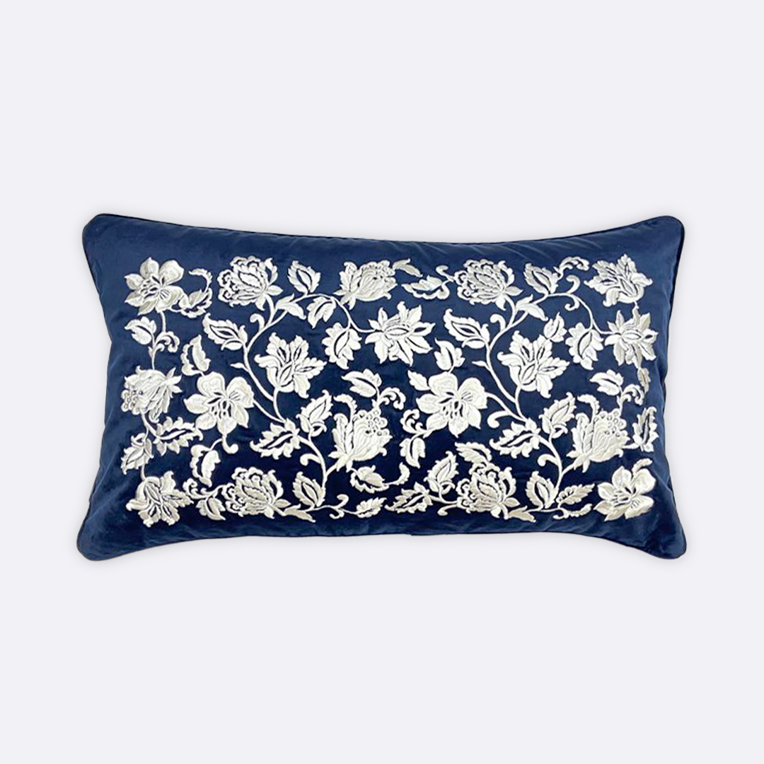 Classic and calming, the Blue Floral Lumbar Cushion Cover brings timeless elegance to everyday living. Crafted in plush velvet, its deep blue base is beautifully contrasted with delicate floral embroidery in soft, light tones, creating a refined play of colour and texture. The elongated lumbar shape adds structure while keeping the look graceful and balanced.