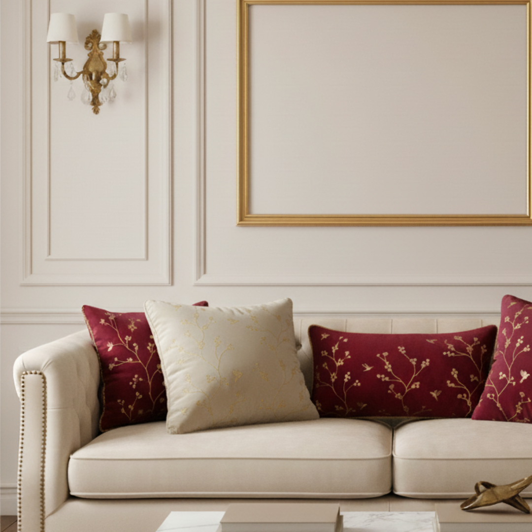 Style tip: Pair with solid claret, beige, or muted gold cushions to let the embroidery shine, or layer with soft neutrals for a balanced, elegant arrangement.