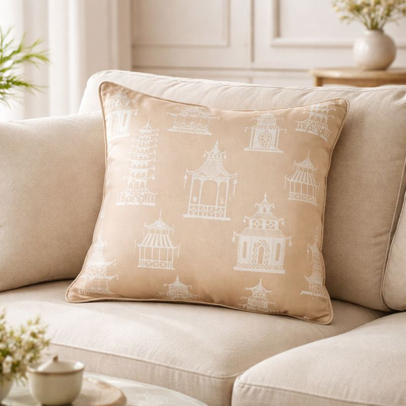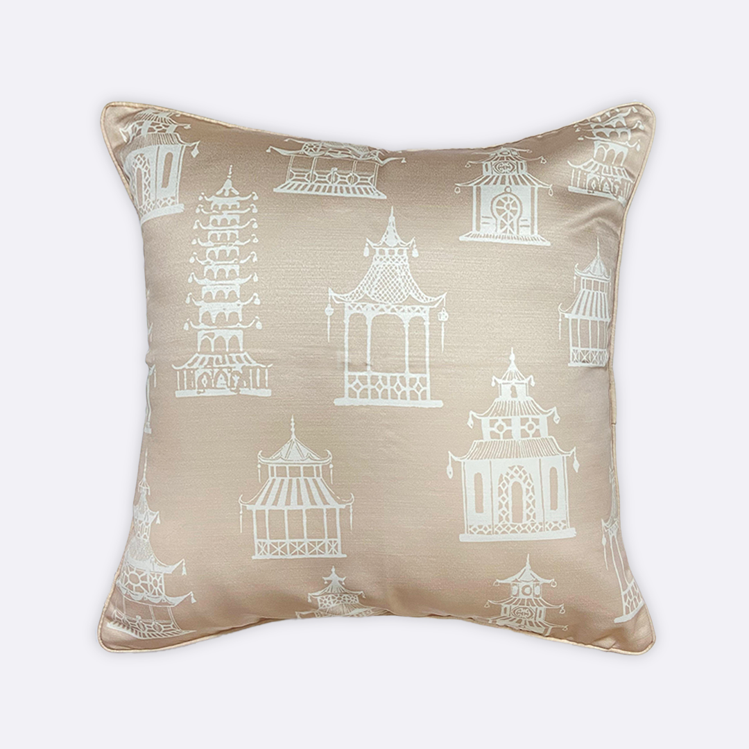 Inspired by classic oriental architecture, the Gold Oriental Pagoda Cushion Cover brings a sense of timeless elegance and cultural richness to your space. The repeating pagoda motifs, rendered in soft gold tones, sit beautifully against a refined sateen base, creating a look that is subtle yet undeniably luxurious.