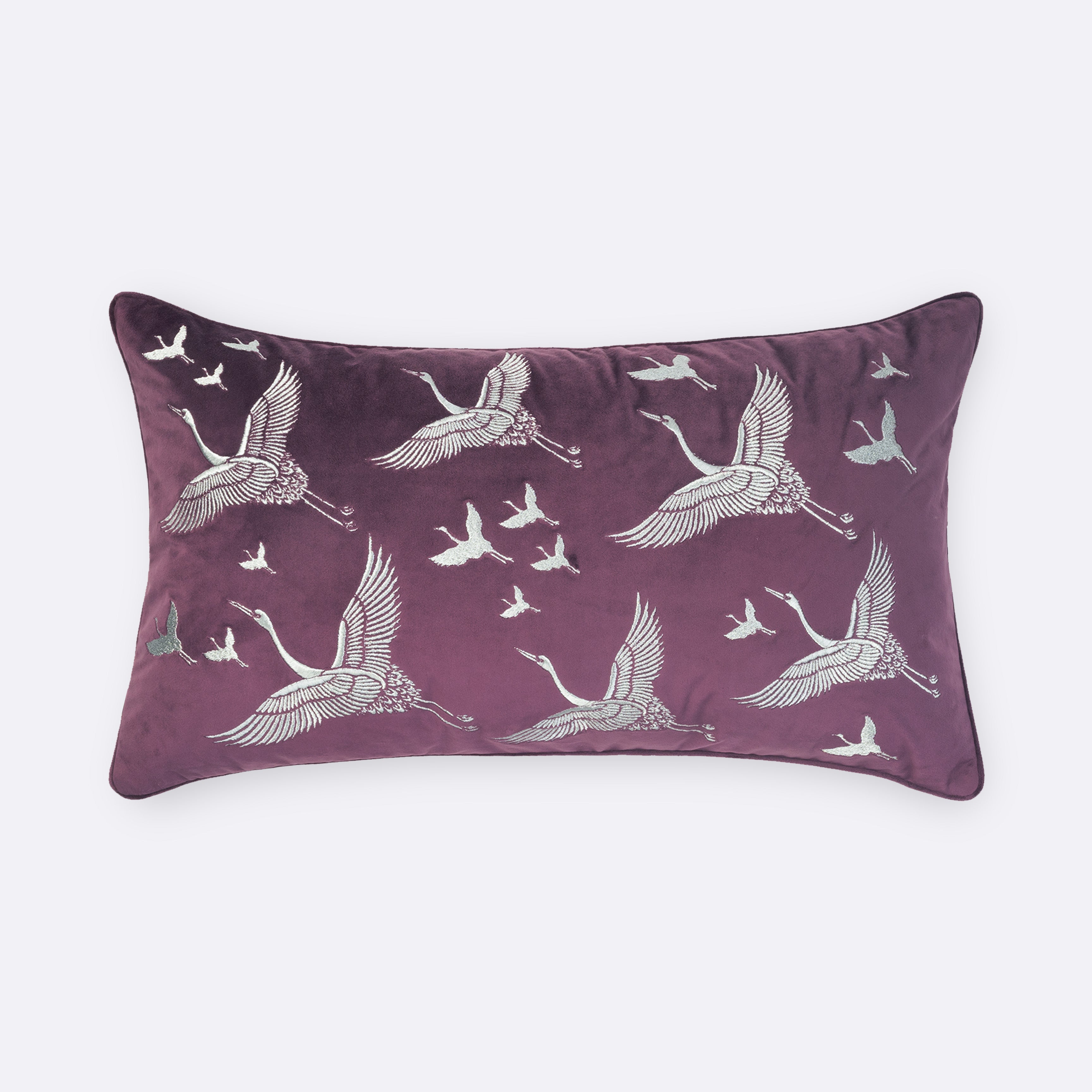 Graceful and poetic, the Mauve Imperial Crane Lumbar Cushion Cover draws inspiration from classical Asian motifs, where cranes symbolise longevity, peace, and quiet strength. Set against a rich mauve velvet base, the delicate crane illustrations bring movement and elegance, making this piece feel refined yet expressive.
