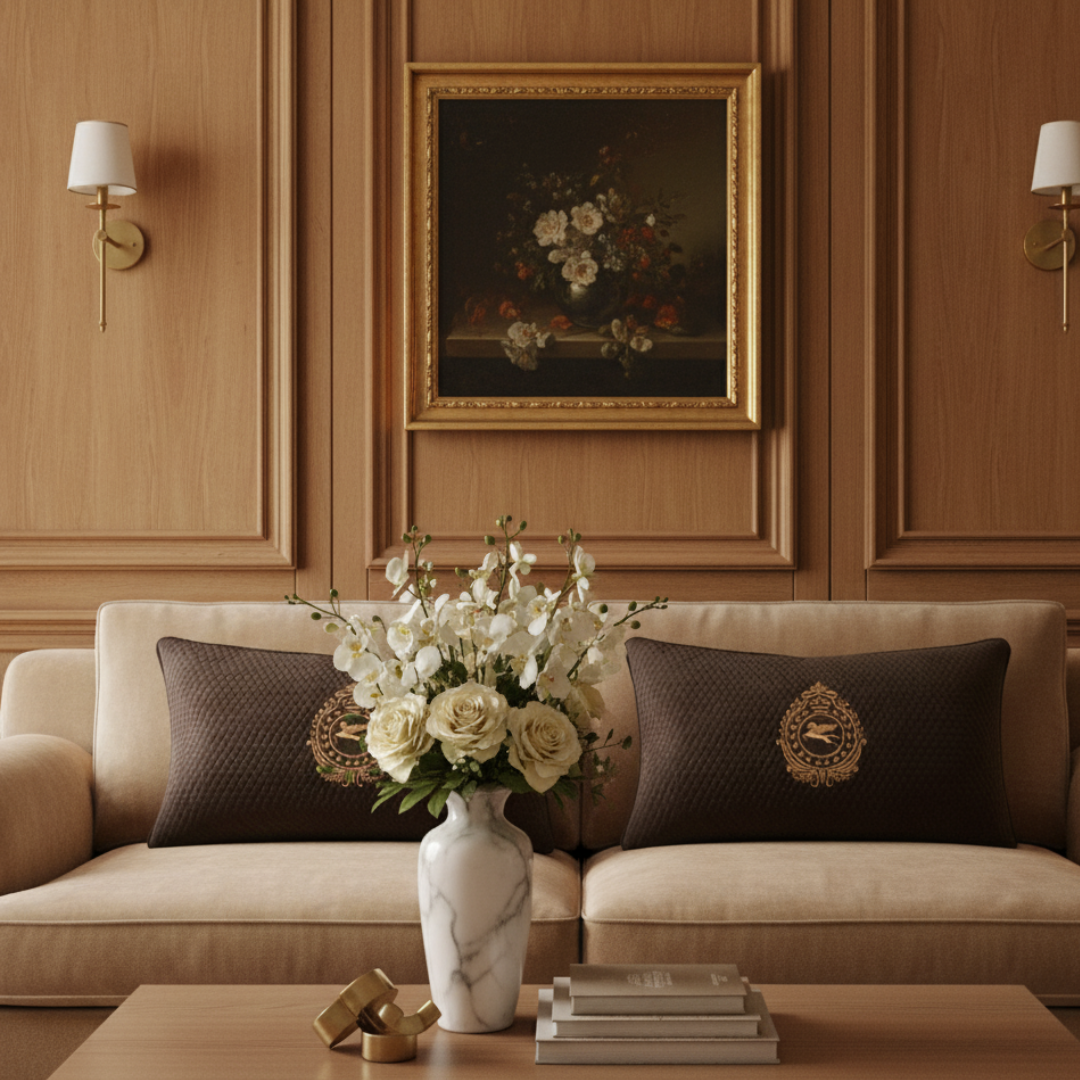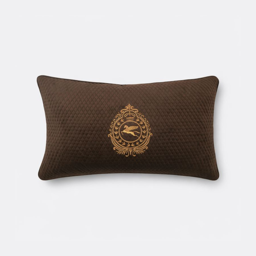 Refined and symbolic, the Pegasus Wonder Lumbar Cushion Cover brings a sense of heritage luxury to modern interiors. Crafted in rich brown velvet, its subtly textured surface is centred with an ornate gold emblem featuring the Pegasus — a timeless symbol of strength, grace, and imagination. The contrast between the deep brown base and the warm metallic detailing feels composed and quietly powerful.