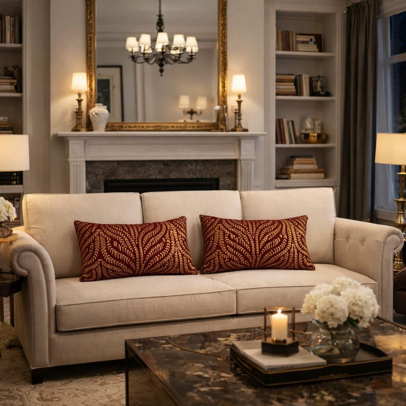Style tip: Pair with solid neutrals like beige, stone, or muted gold cushions to let the vine pattern stand out, or layer with deeper reds and browns for a richly composed, heritage look.
