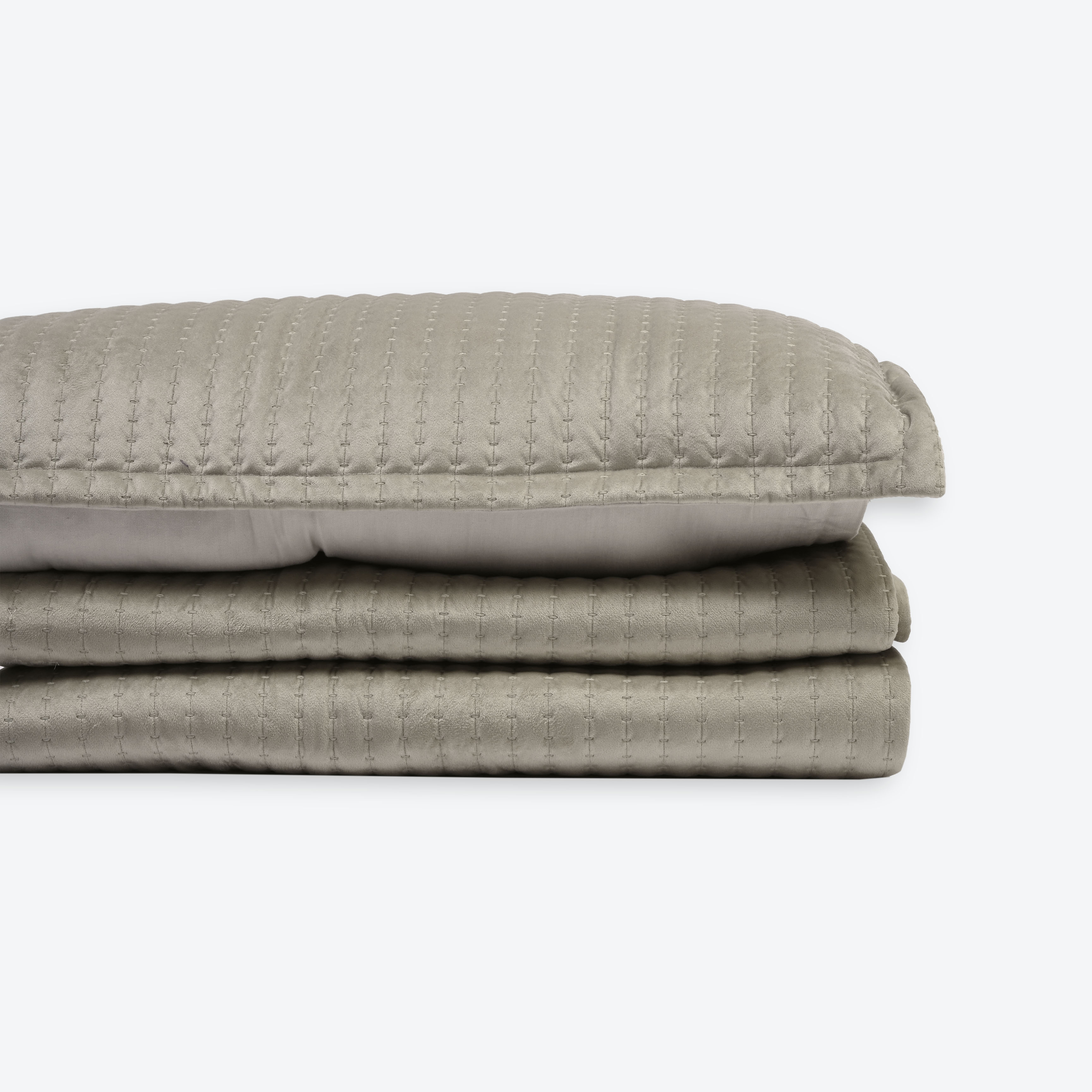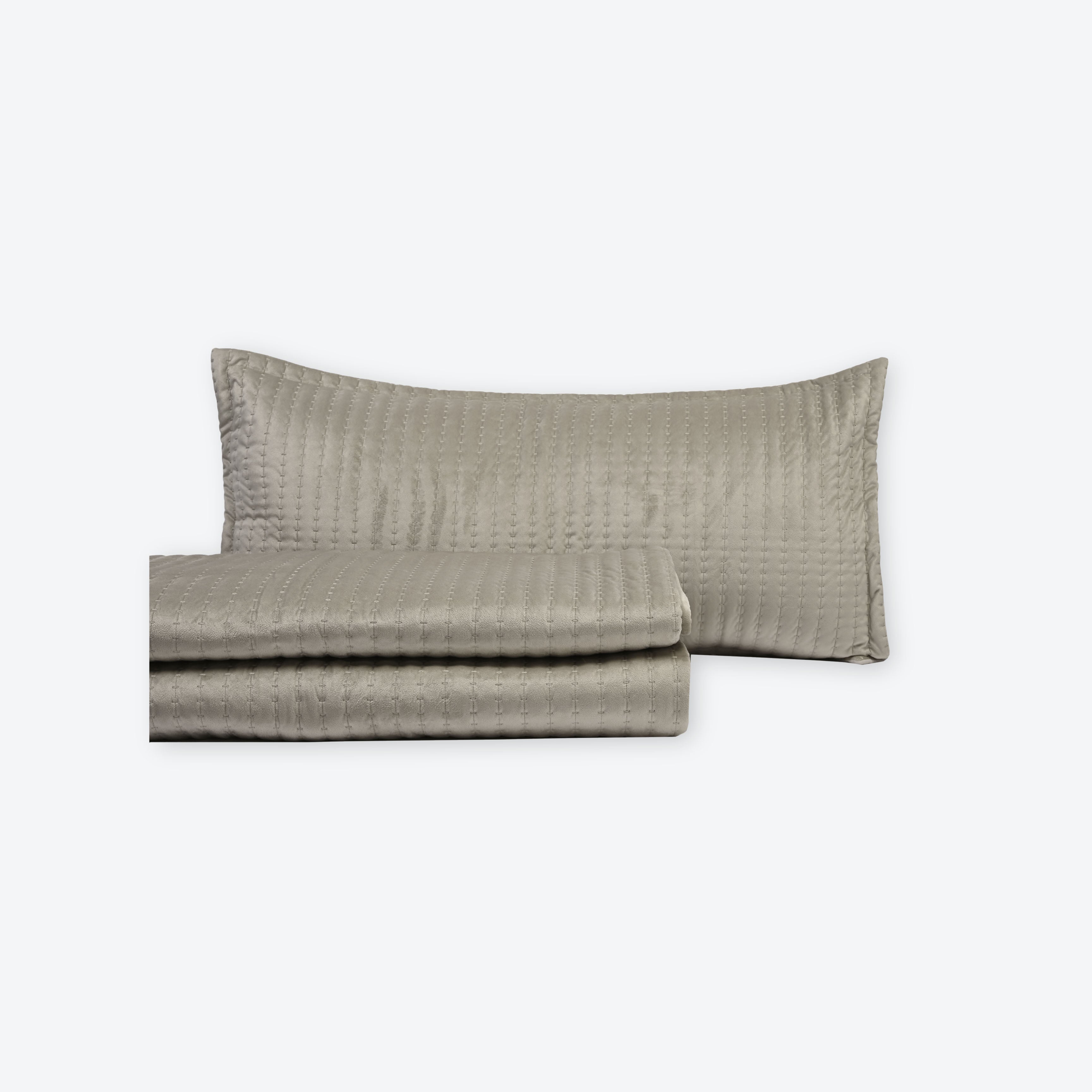 Crafted in weighty velvet with a soft kantha-inspired stitch in tonal thread, the Softstone Bedspread brings warmth and quiet grandeur to the bedroom. Off-white on beige keeps the palette grounded, while the texture does all the talking.