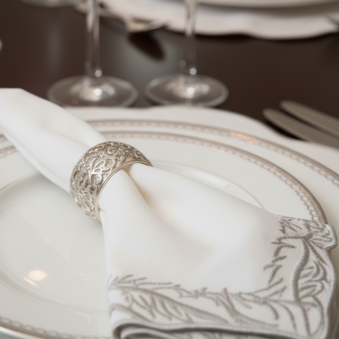 Indulge in the opulence and elegance of our premium Silver Leaf Napkin in white/silver. It's a stunning adornment that elevates any dining experience to a luxurious culinary event.