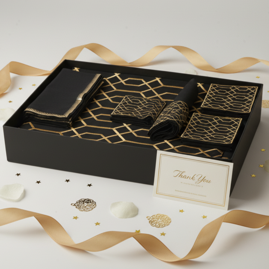 Wrapped in our signature black box with a satin ribbon and branded tag, this set is ideal for wedding gifts, Diwali gestures, or housewarmings where nothing less than grandeur will do.