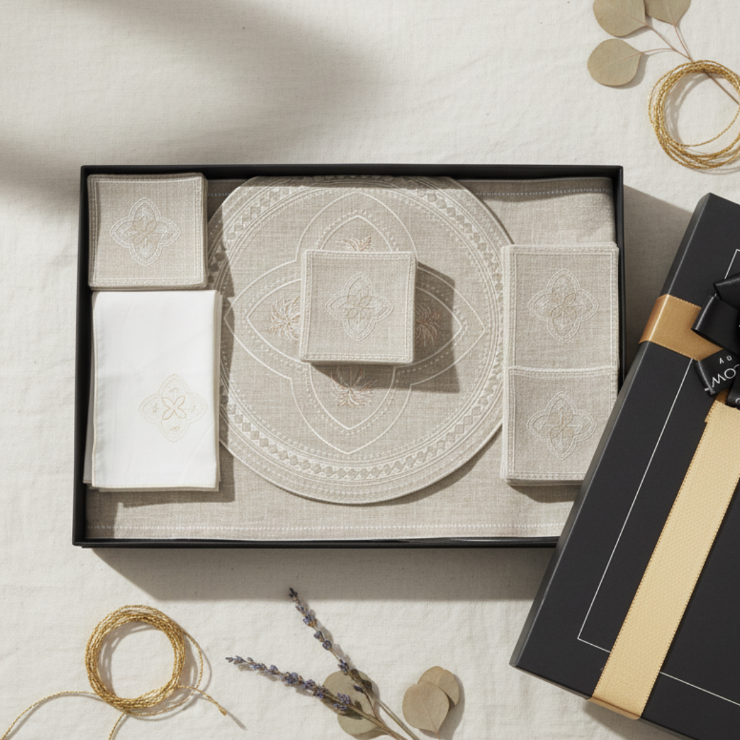 Designed for those who entertain with intention, each component is made to layer seamlessly — from the precision of our coasters to the refinement of our napkins and holders. Together, they form a harmonious whole: a table that speaks before the meal begins.