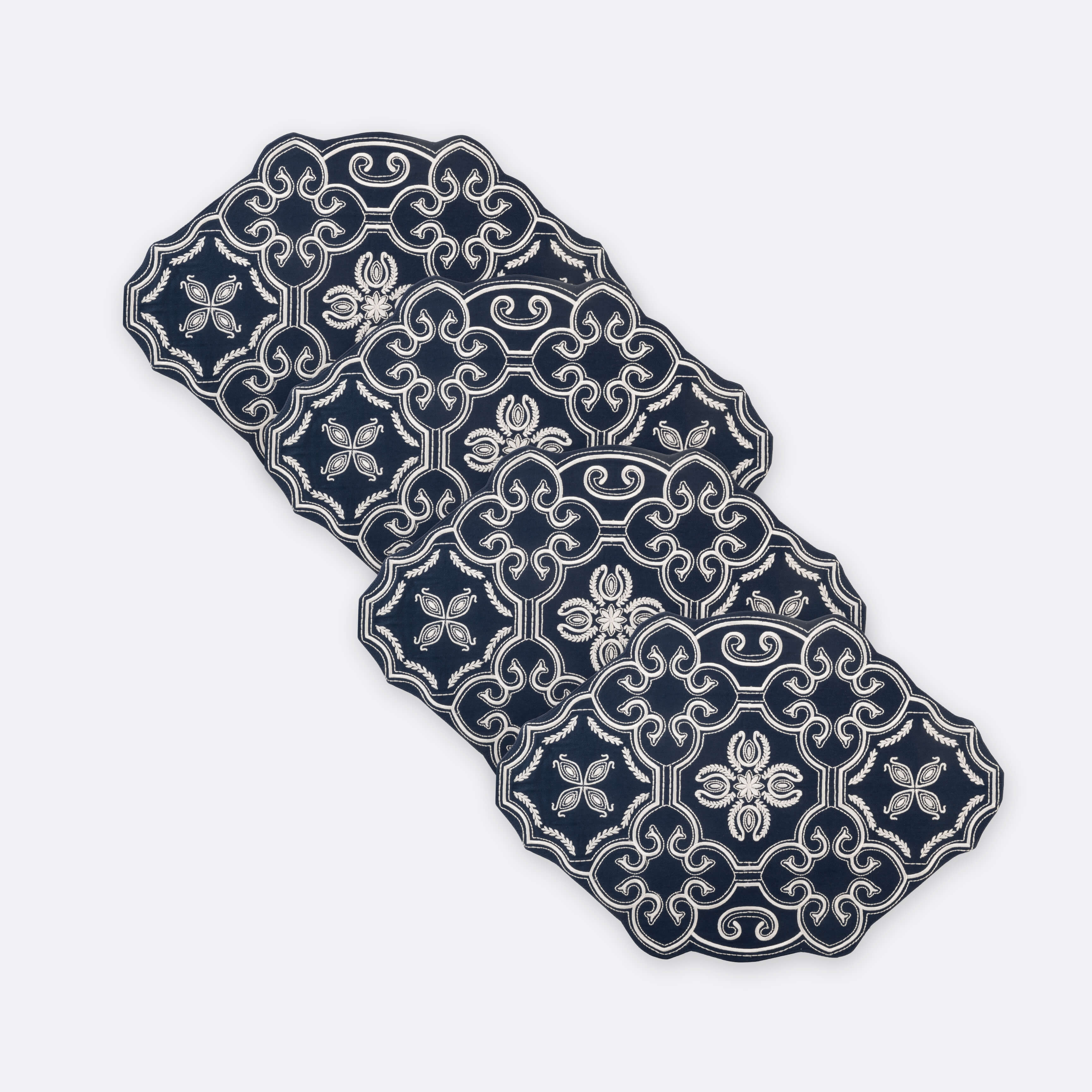 Intricately embroidered in soft white threads, the Blue Medallion Placemats bring a regal touch to dining. The ornate pattern on navy velvet reflects a timeless sophistication — ideal for festive or formal tables.