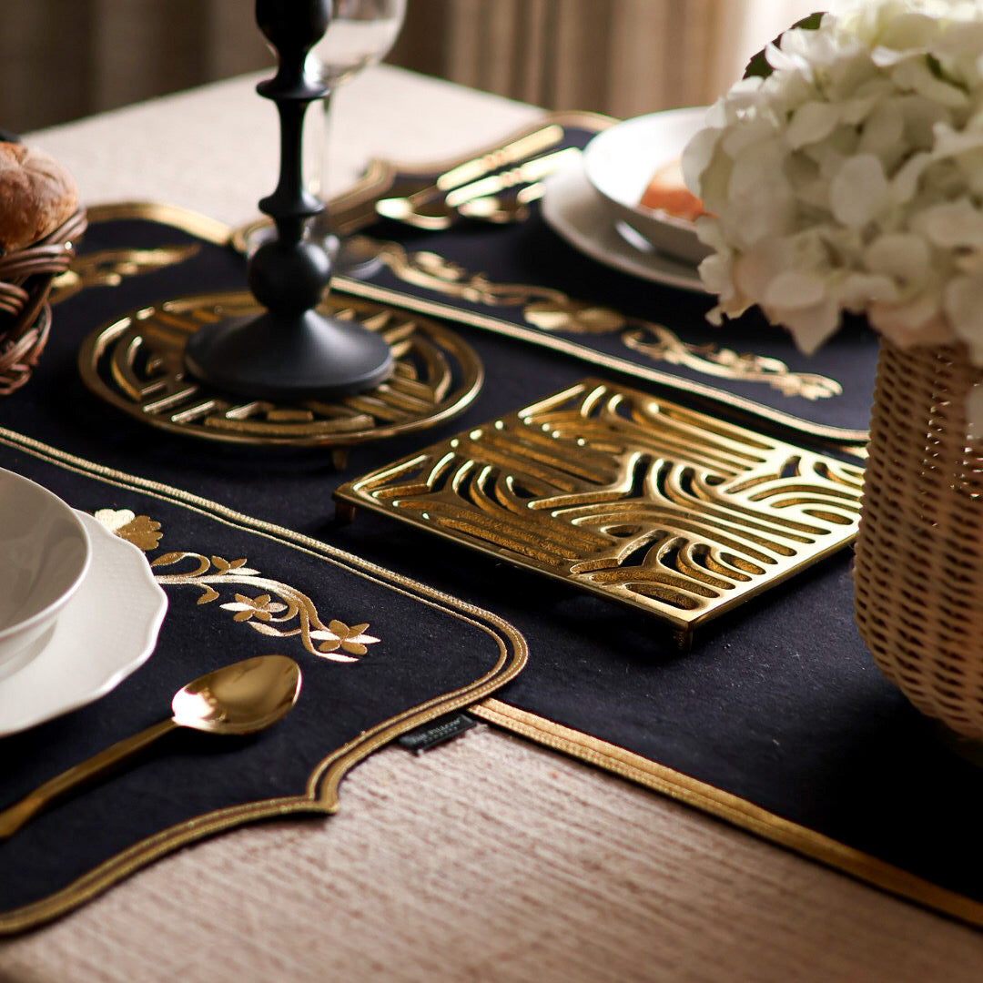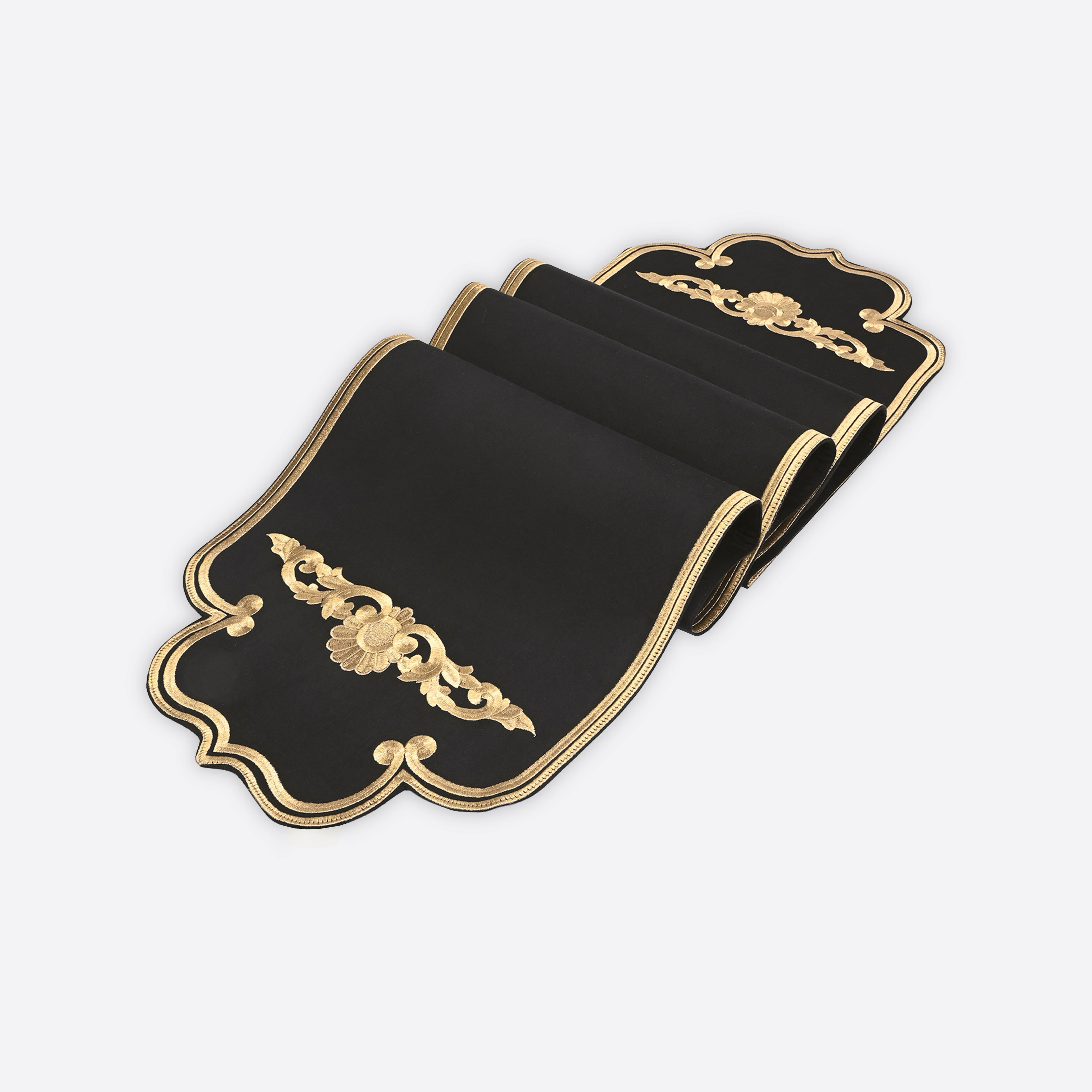 Designed as the perfect partner to your bestselling placemats, the Black Regal Table Runner features flowing gold embroidery on cotton, creating an atmosphere of royal grandeur.