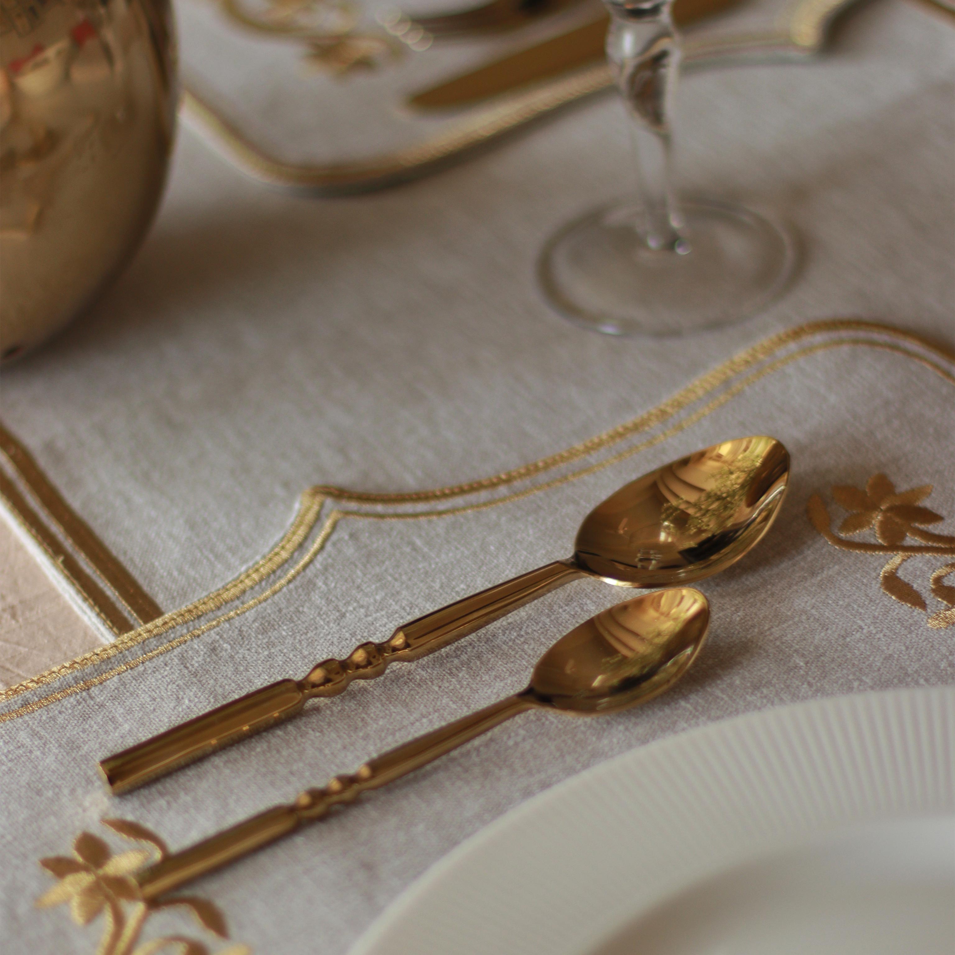 Timeless and regal, the Beige Regal Placemats feature hand-embroidered golden scrollwork on a natural linen-blend base. Each scalloped edge is precision-finished, balancing ornate detail with quiet refinement — the hallmark of The Pillow Company’s Exclusive Best-sellers.