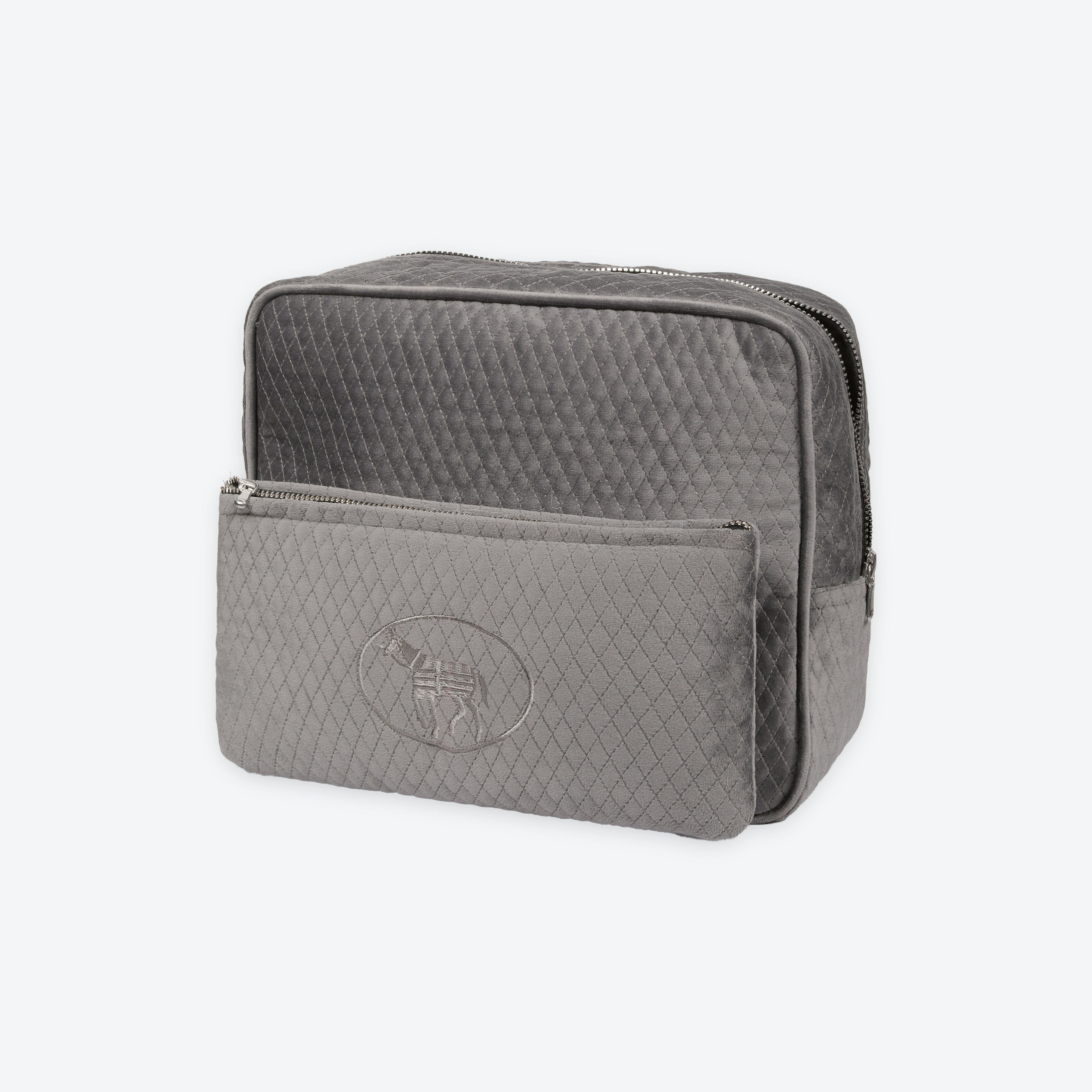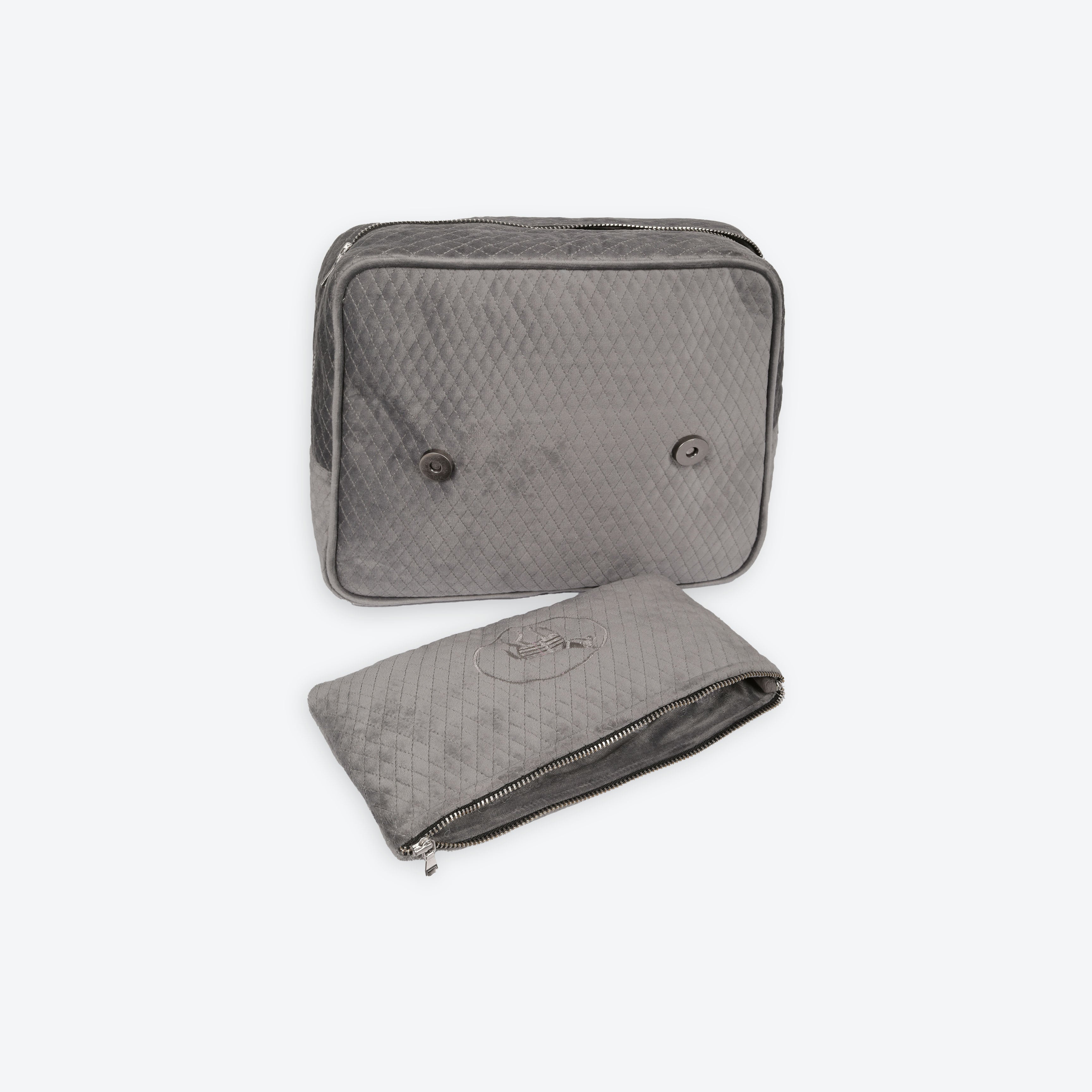 Designed as your personal wellness companion, the Spa To Go Pouch brings intention to every moment of self-care. Crafted in plush quilted velvet with a detachable embroidered mini pouch, it carries everything you need for relaxation — from skincare and serums to travel-sized oils and bath rituals.