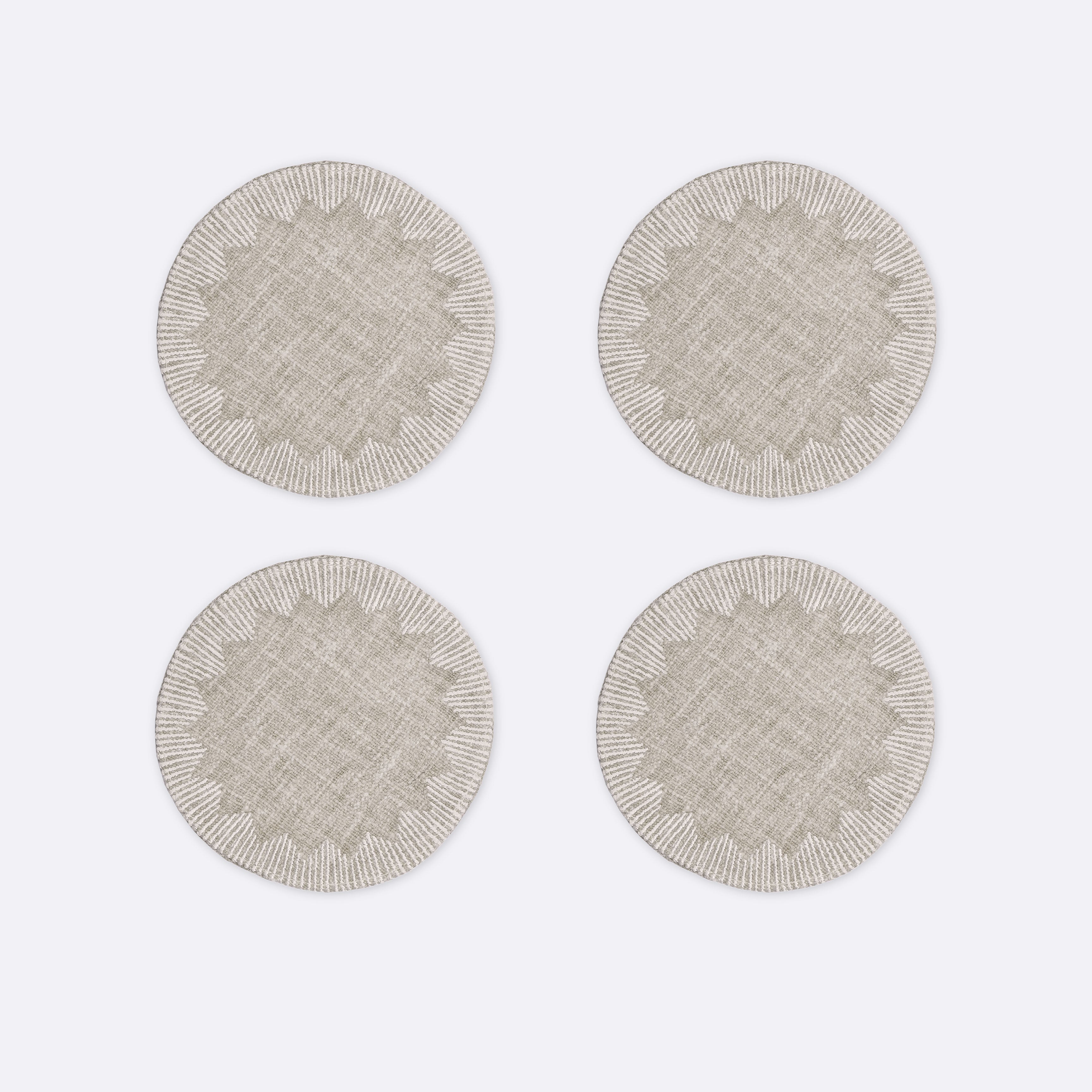 The Beige Celeste Coasters feature a radiant embroidery pattern inspired by the sun — simple yet striking. Designed in a neutral tone, they add understated refinement to every sip.