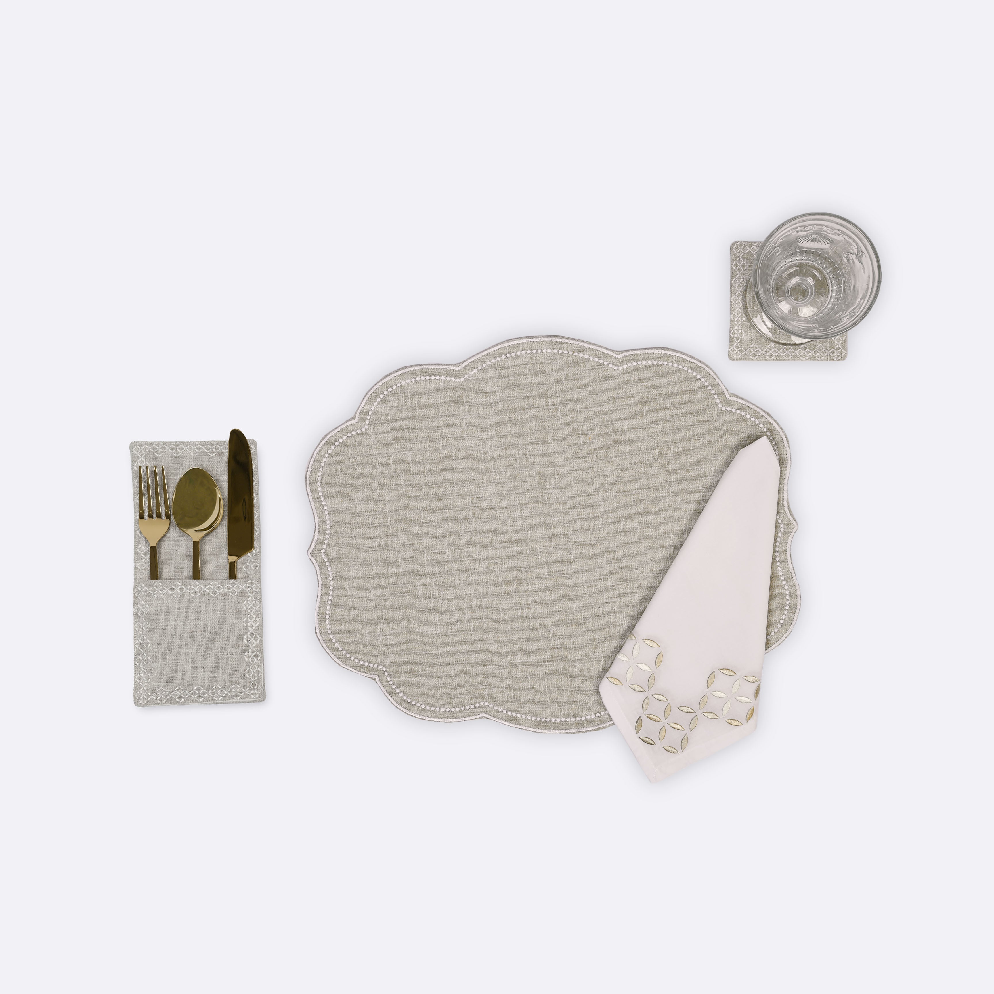 Softly textured with diamond border embroidery, the Beige Meadow Coasters bring warmth and quiet charm to any table. Crafted in a natural linen blend, they balance utility with timeless design.