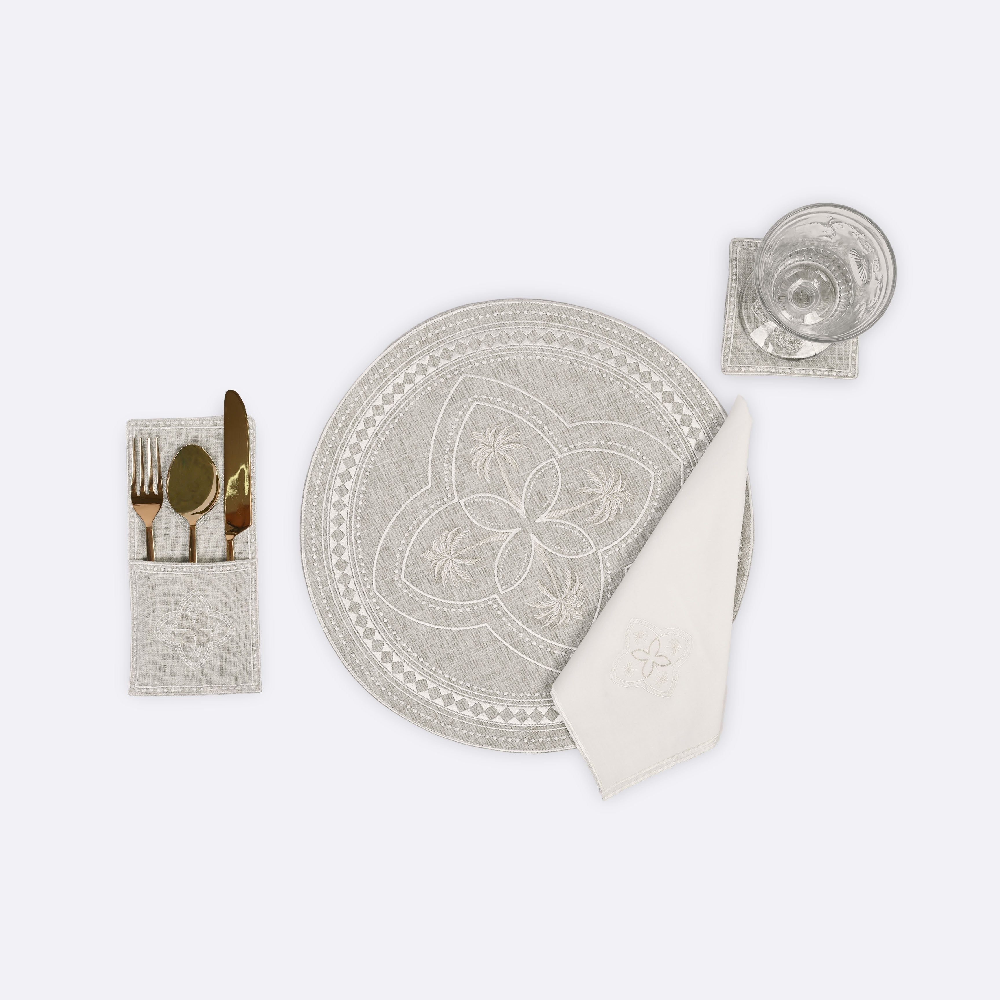 The Casa Palma Coasters are a study in quiet geometry — embroidered with a palm-inspired motif that evokes breezy verandas and timeless craftsmanship. Elegant and functional, they anchor your table setting with ease.