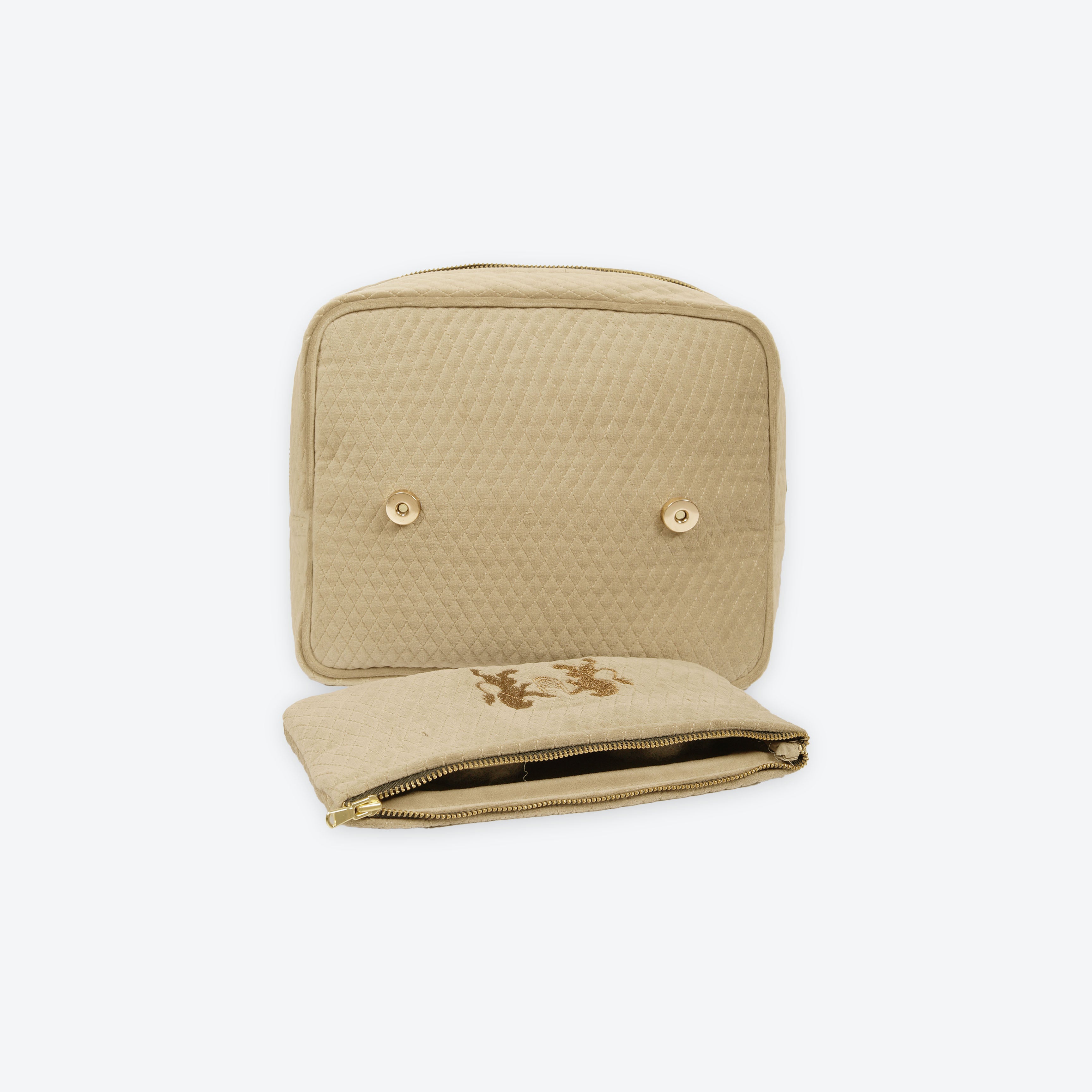 Designed as your personal wellness companion, the Spa To Go Pouch brings intention to every moment of self-care. Crafted in plush quilted velvet with a detachable embroidered mini pouch, it carries everything you need for relaxation — from skincare and serums to travel-sized oils and bath rituals.