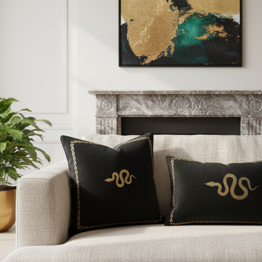 A bold statement of refinement — this square cushion features an intricately embroidered gold serpent framed by a fine geometric border. Dramatic yet elegant, it anchors any setting with strength and mystique.