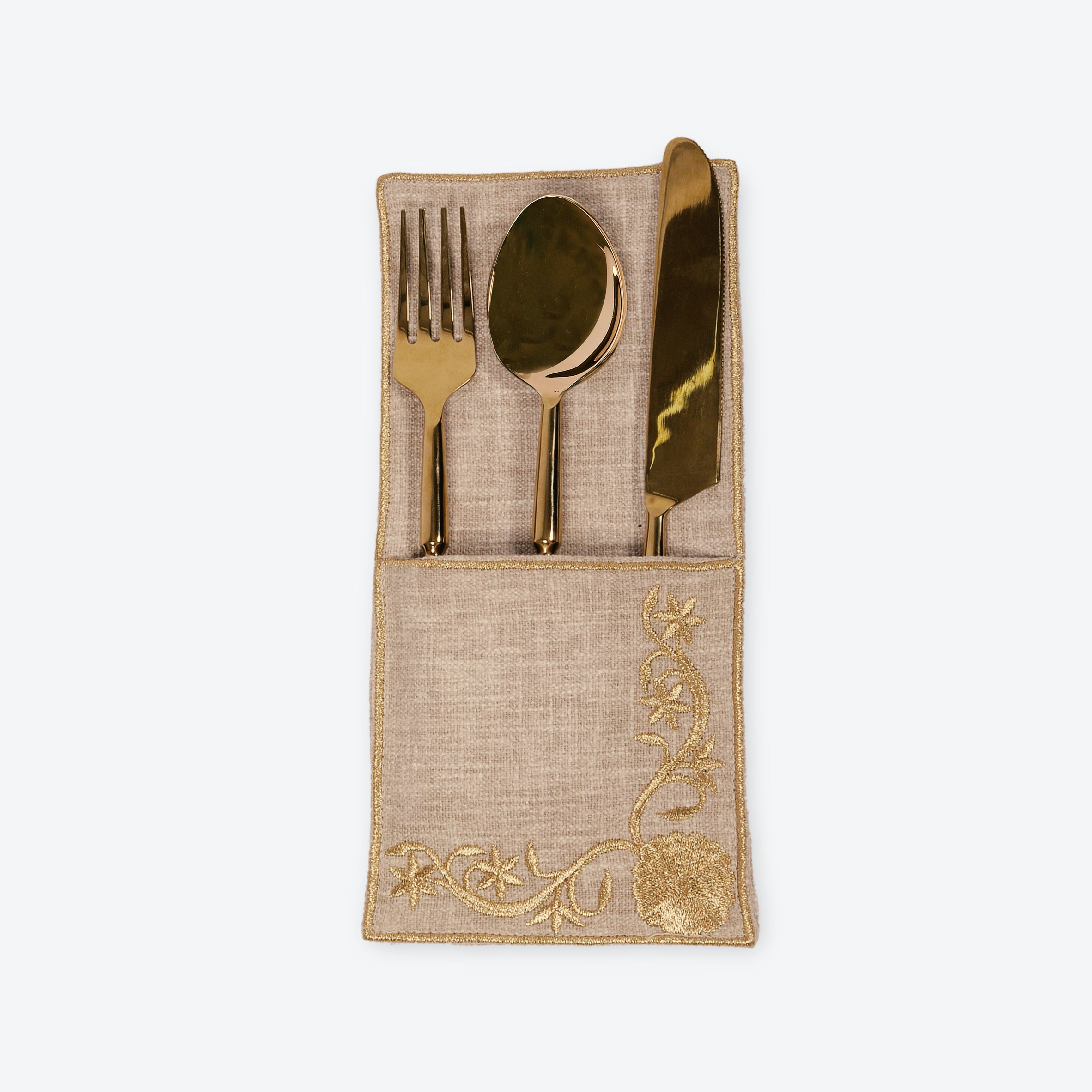 Crafted in a fine cotton blend with intricate gold embroidery, the Beige Regal Cutlery Holder brings quiet elegance to the dining table. Designed to rest neatly beside each placemat, it keeps flatware organized while adding a touch of festive refinement. The soft beige base and metallic detailing pair beautifully with neutral or gold-accented tablescapes, making it ideal for both everyday entertaining and formal dinners.