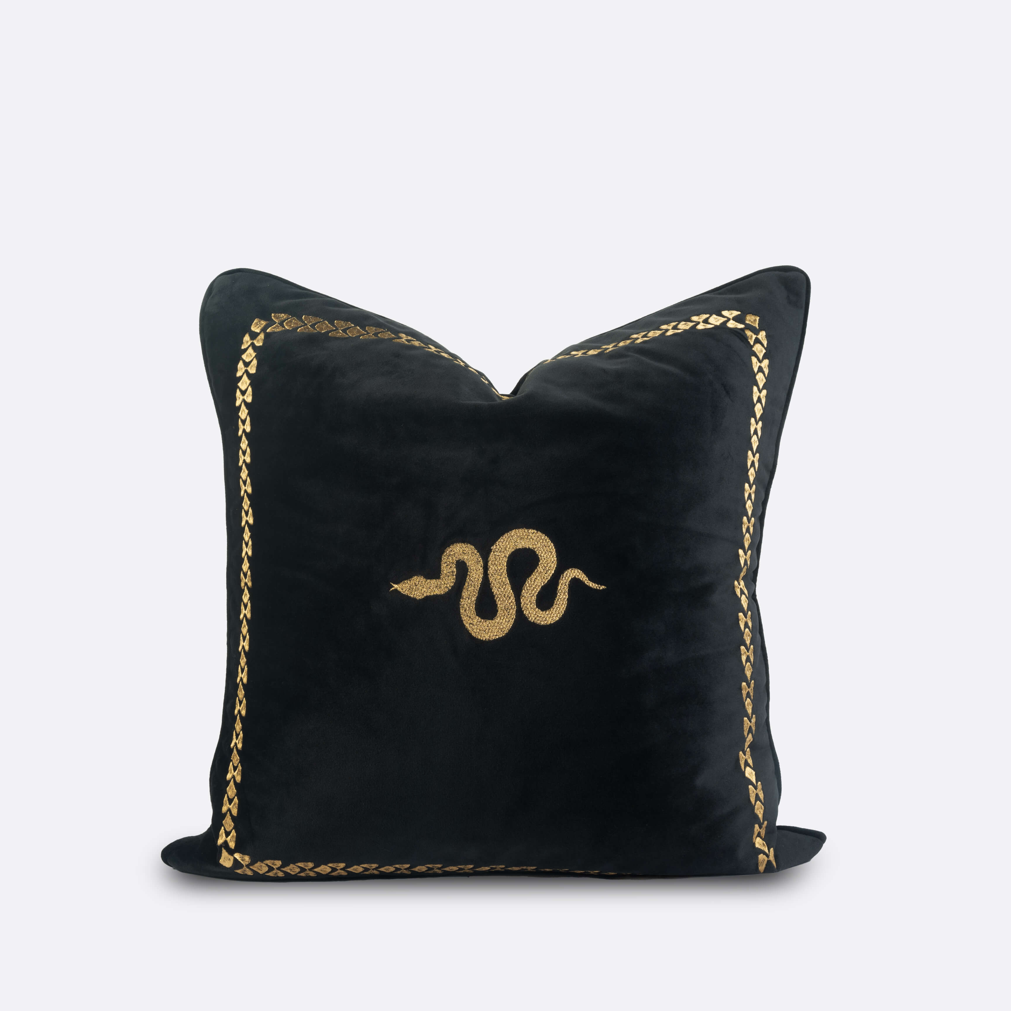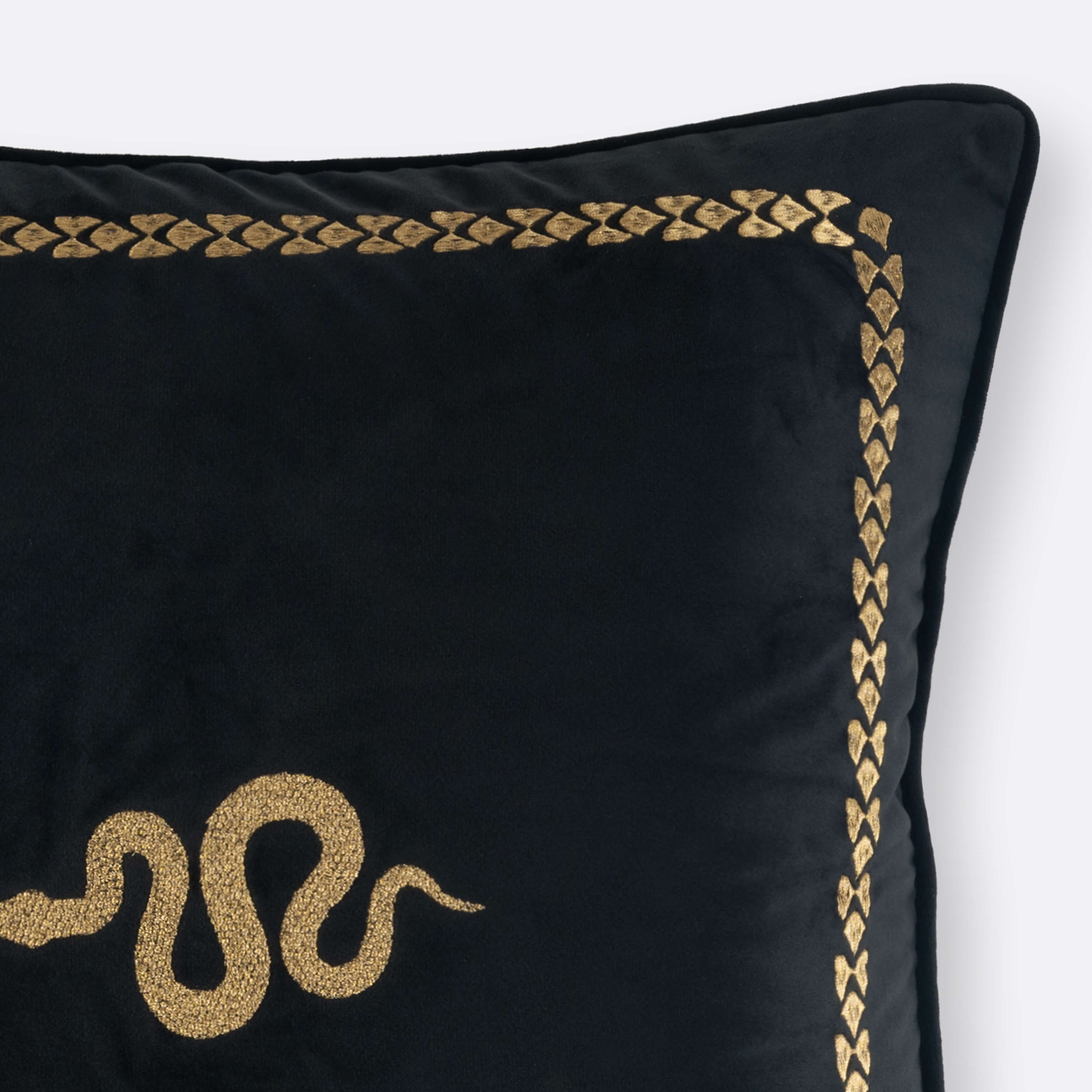 Add a touch of stylish luxury to your home decor with our Snake Cushion Cover in Black. Made from high-quality materials, this cover offers both comfort and durability. Its unique snake skin pattern adds a touch of sophistication to any room. Upgrade your living space with this luxurious and stylish Cushion cover today. Fabric - Velvet Dry Clean Only Exclusive to The Pillow Company Please note that colours on the actual product may vary slightly.