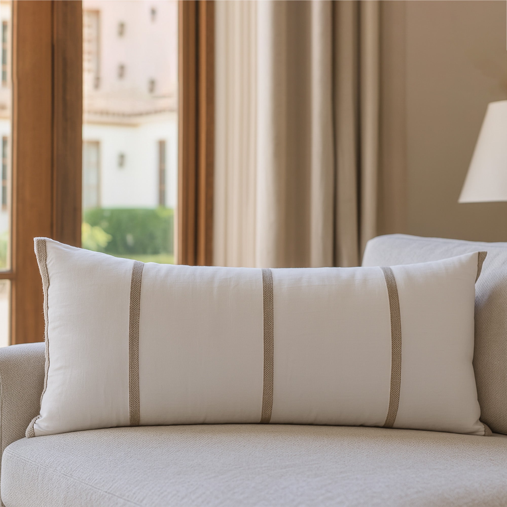 Simple, structured, and refined — the Wickerstitch Linen Lumbar Cushion Cover brings a tailored accent to contemporary spaces. The crisp white base is framed with subtle woven stripes that give it a clean, architectural edge — perfect for beds, benches, or minimalist living rooms.